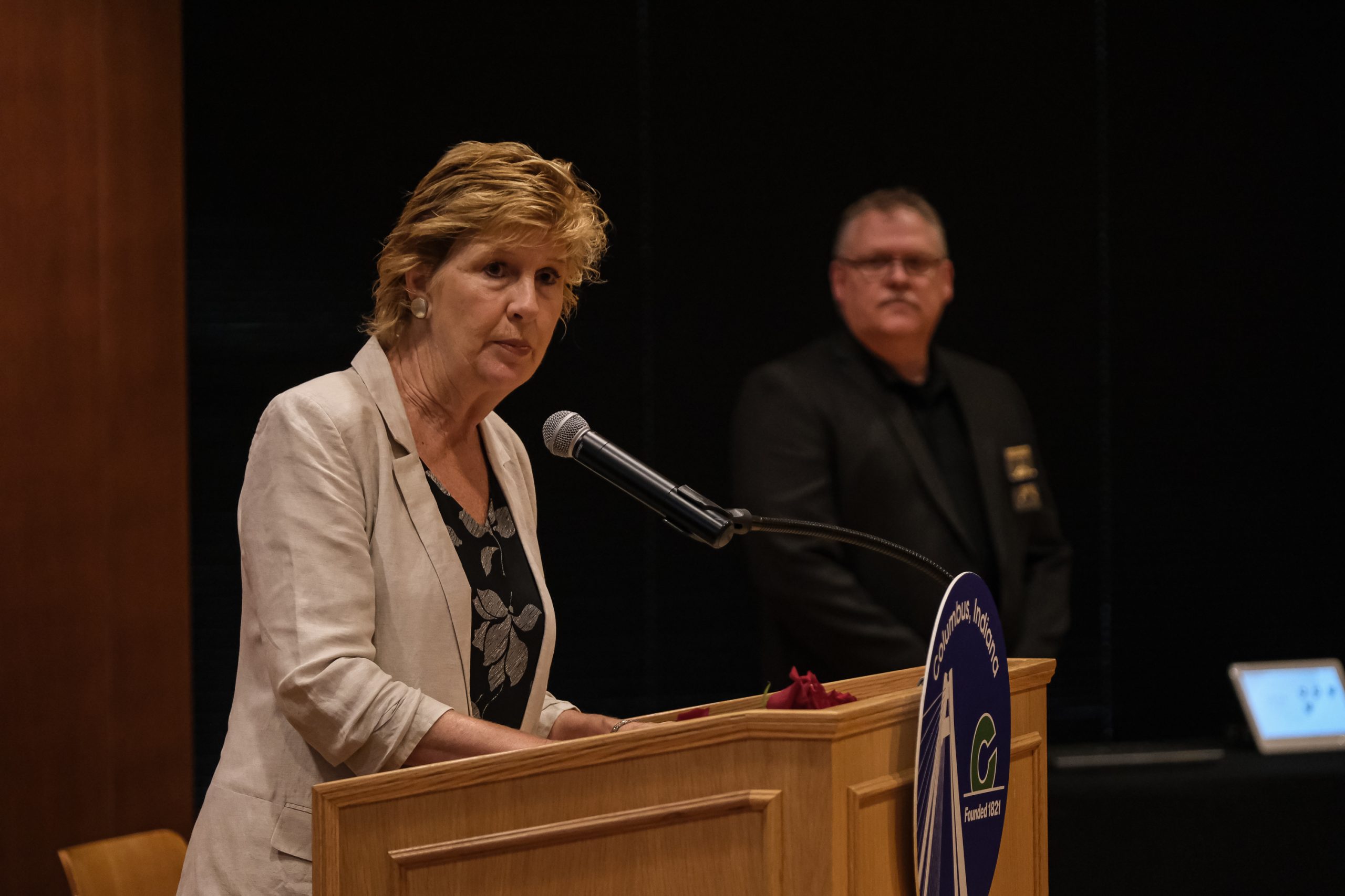Columbus Mayor Mary Ferdon welcomes guests to the annual Public Safety Memorial Service at Columbus City Hall in Columbus, Ind., Friday, May 17, 2024.