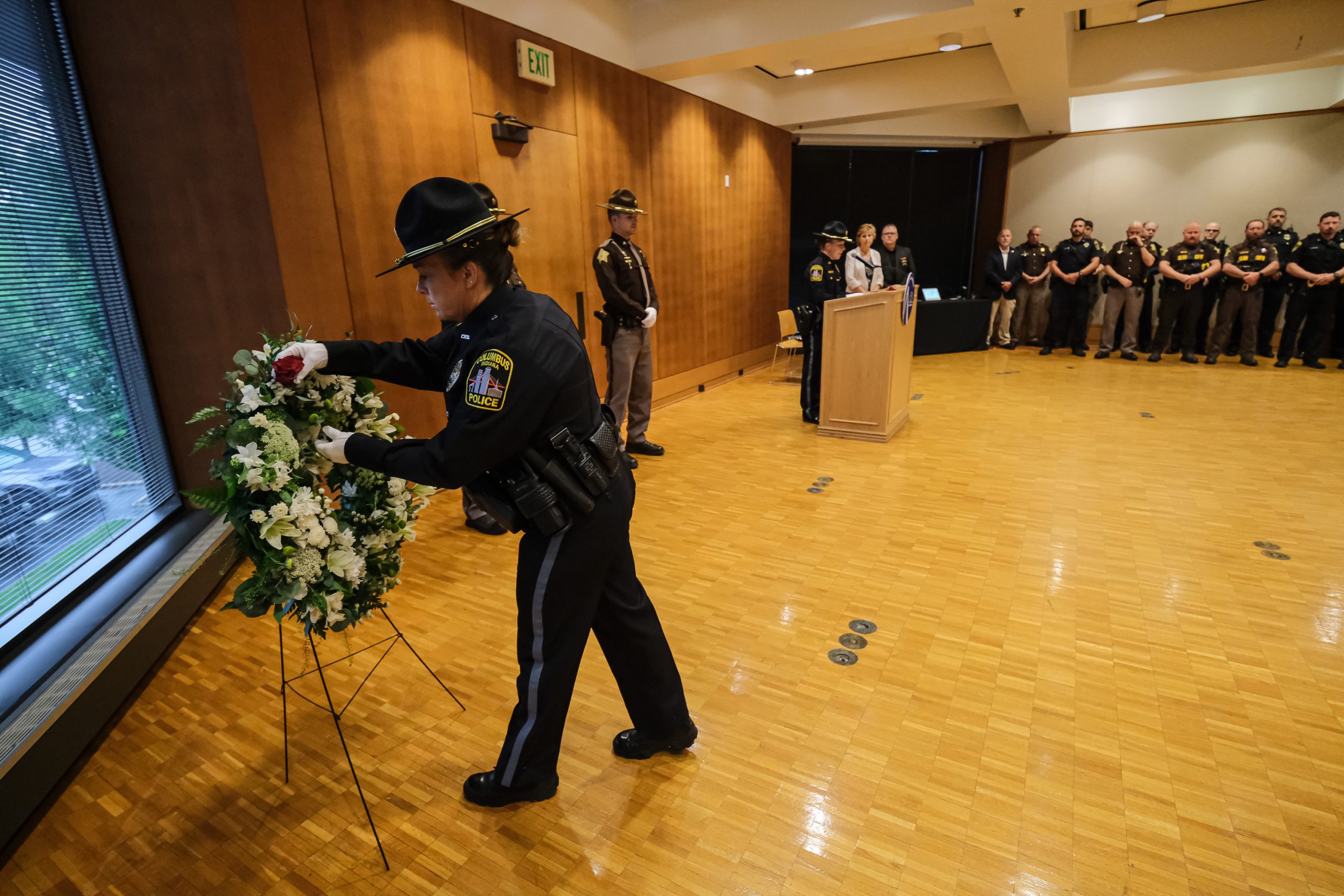 Columbus police officer Angie Owens places a red rose on a wreath in honor of a fallen law enforcement officer from Indiana during the annual Public Safety Memorial Service at Columbus City Hall in Columbus, Ind., Friday, May 17, 2024.
