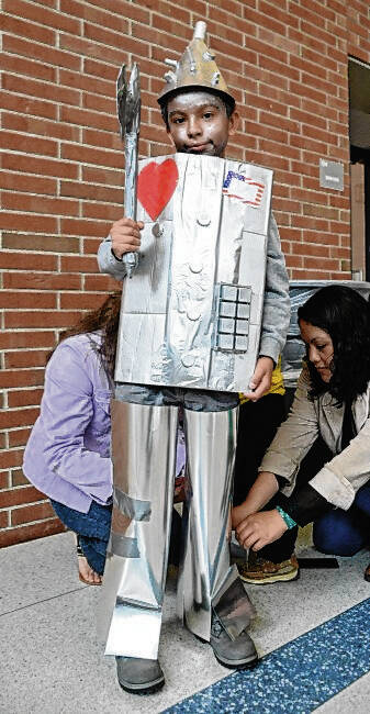 While adults encase him in his metallic costume, Jose Hernandez, a Taylorsville third-grader, awaits the start of the costume contest at the Central Middle School Literacy Festival on May 17, 2014.