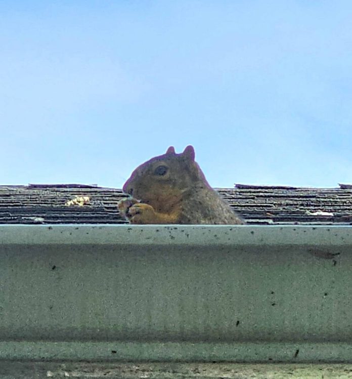 Cindy Mead appreciated this squirrel’s help in cleaning out the gutters on May 6!