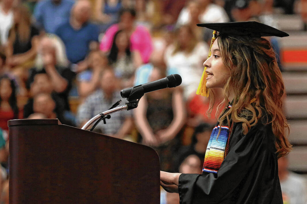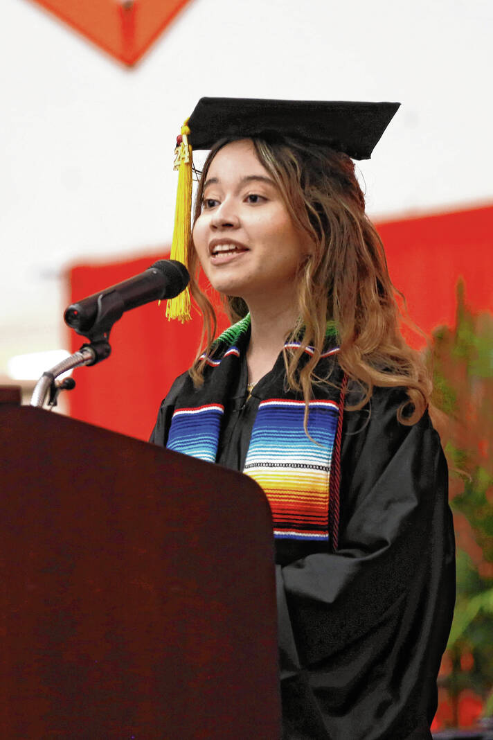 Carla Clark | For The Republic Janelly Villalobos gives the student farewell during the CSA New Tech Commencement Ceremony at Columbus East High School, Columbus, Ind., Friday, May 24, 2024.