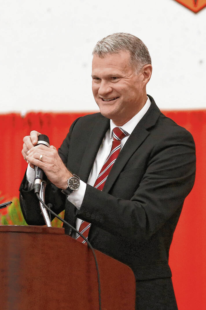 Carla Clark | For The Republic Mike Reed gives the principal’s welcome during the CSA New Tech Commencement Ceremony at Columbus East High School, Columbus, Ind., Friday, May 24, 2024.