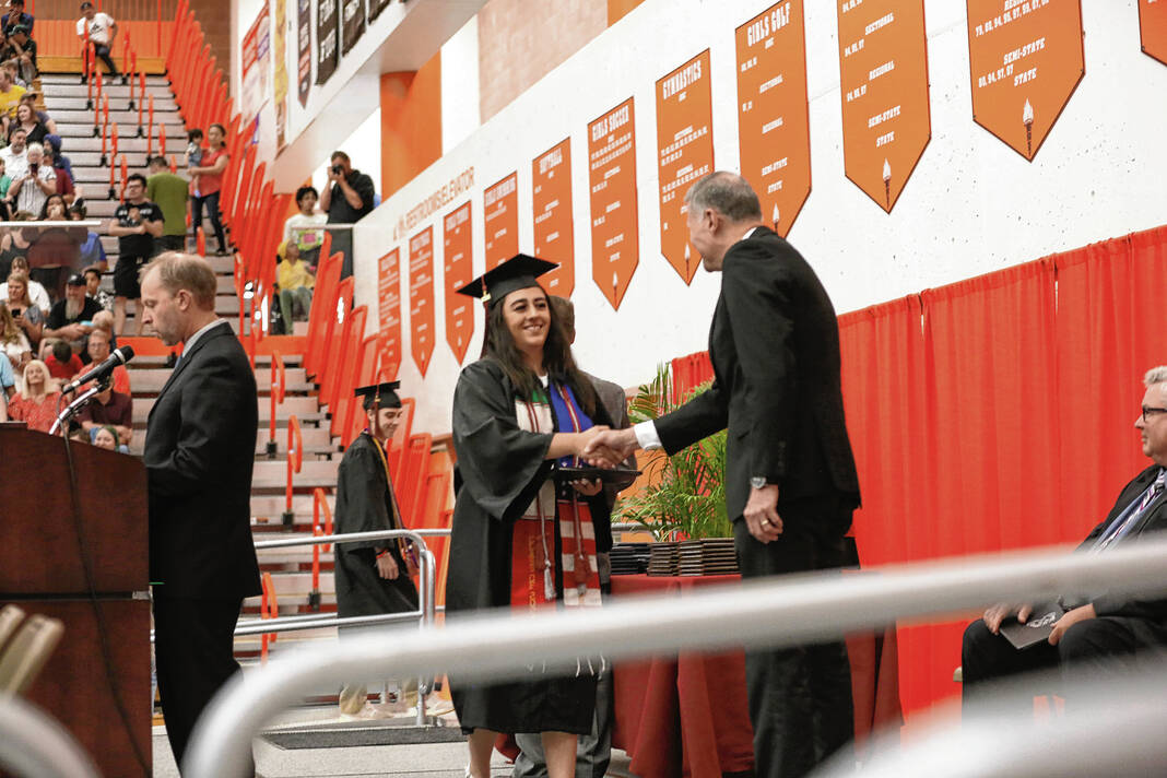 Carla Clark | For The Republic Andrianna Lynn Bustos shakes the hand of Dr. Jim Roberts during the CSA New Tech Commencement Ceremony at Columbus East High School, Columbus, Ind., Friday, May 24, 2024.