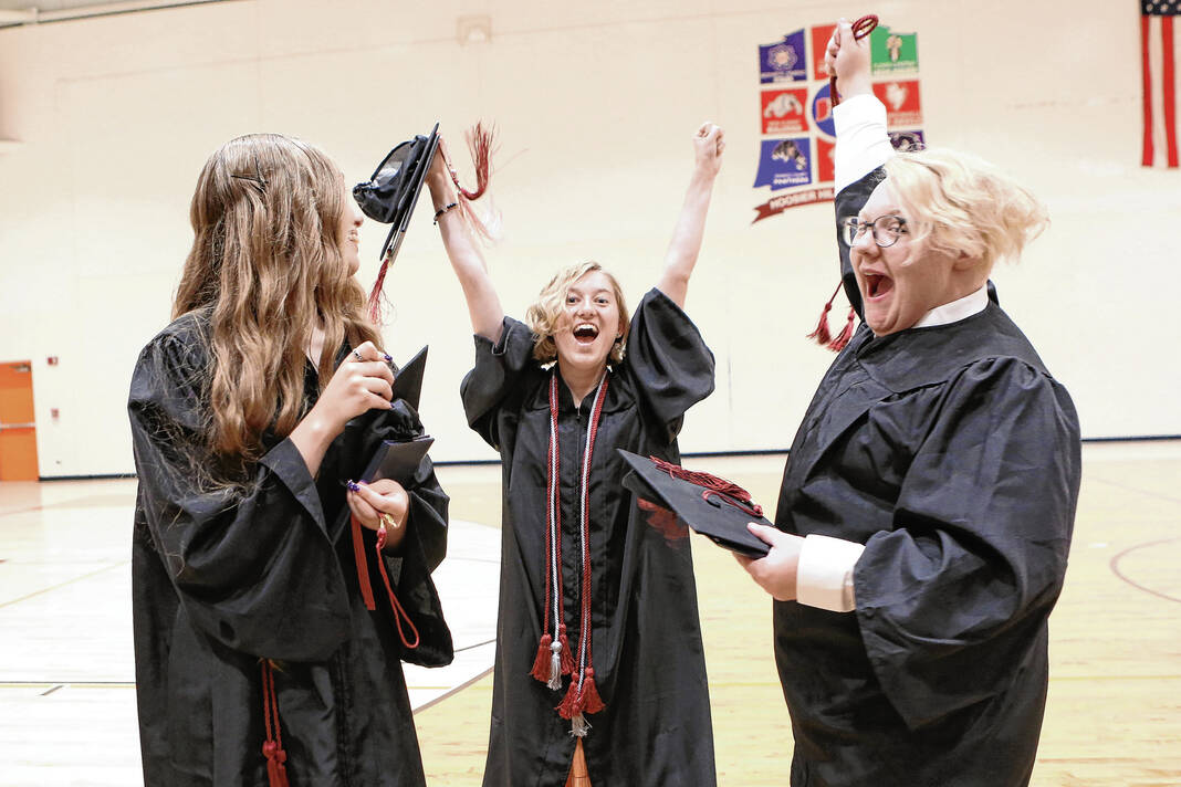 Carla Clark | For The Republic Sophia Bass, center and Cameron Hatfield celebrate their graduation during the CSA New Tech Commencement Ceremony at Columbus East High School, Columbus, Ind., Friday, May 24, 2024.