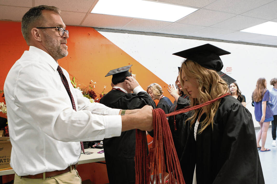 Carla Clark | For The Republic Teacher Matt Morrill gives Ella Howard her tassels during the CSA New Tech Commencement Ceremony at Columbus East High School, Columbus, Ind., Friday, May 24, 2024.