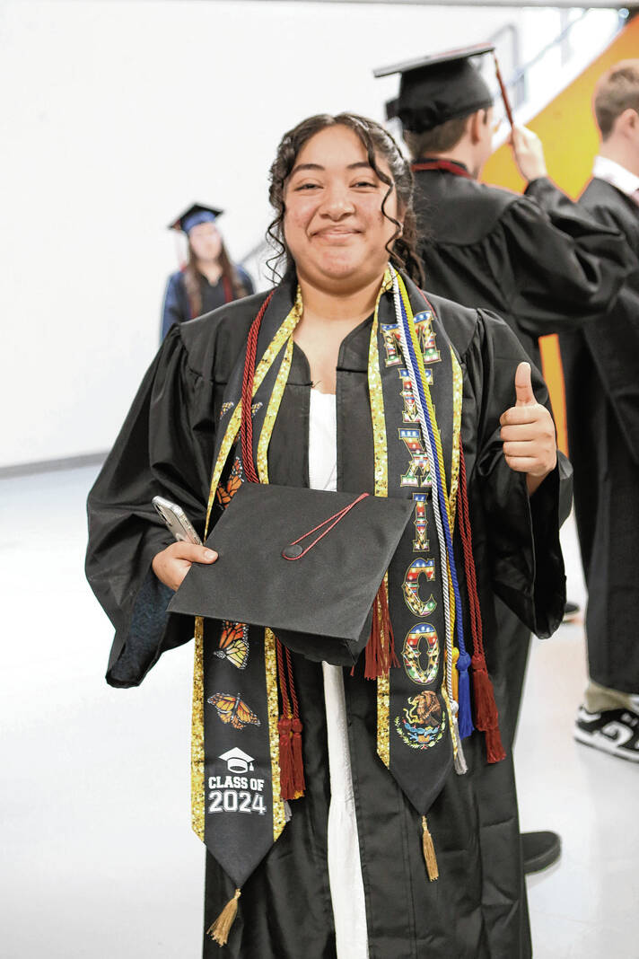 Carla Clark | For The Republic Lesli Flores gives a thumbs up during the CSA New Tech Commencement Ceremony at Columbus East High School, Columbus, Ind., Friday, May 24, 2024.