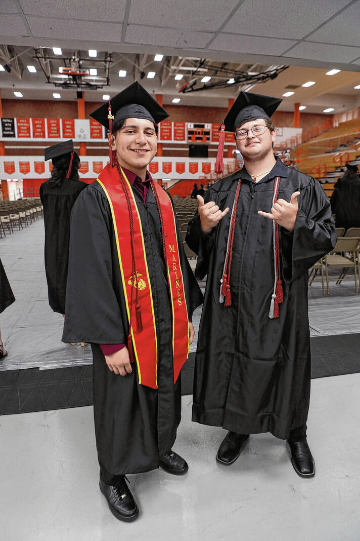 Carla Clark | For The Republic Tony Sanchez, who will be leaving for the Marines in August, and Brandon King pose for a photograph during the CSA New Tech Commencement Ceremony at Columbus East High School, Columbus, Ind., Friday, May 24, 2024.