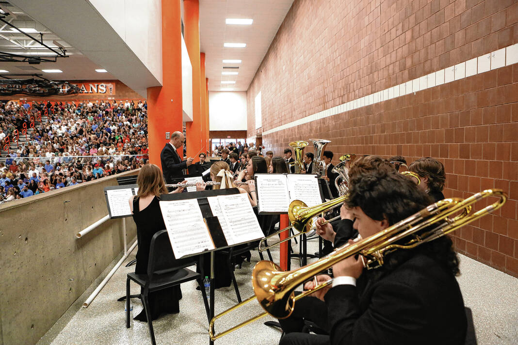 Carla Clark | For The Republic Tim Brookshire, at left, leads the band as they play Pomp and Circumstance during the 51st Annual Commencement of Columbus East High School, Columbus, Ind., Saturday, May 25, 2024.