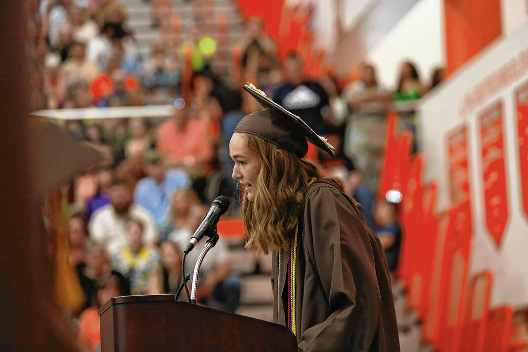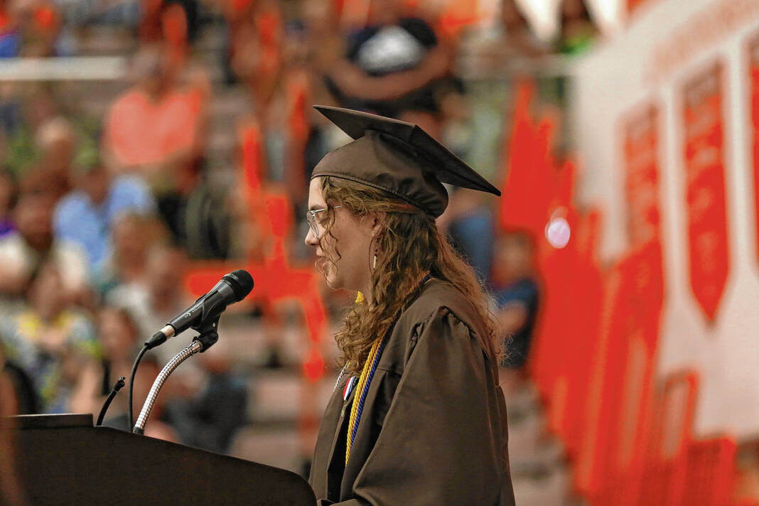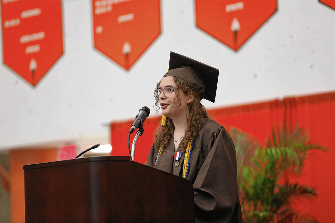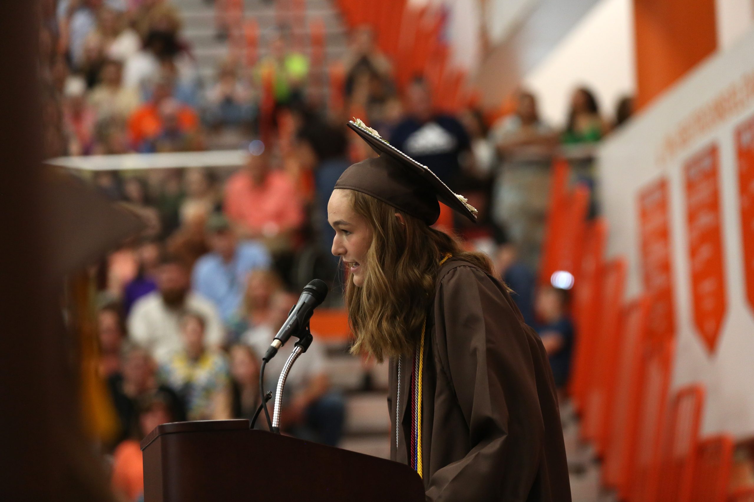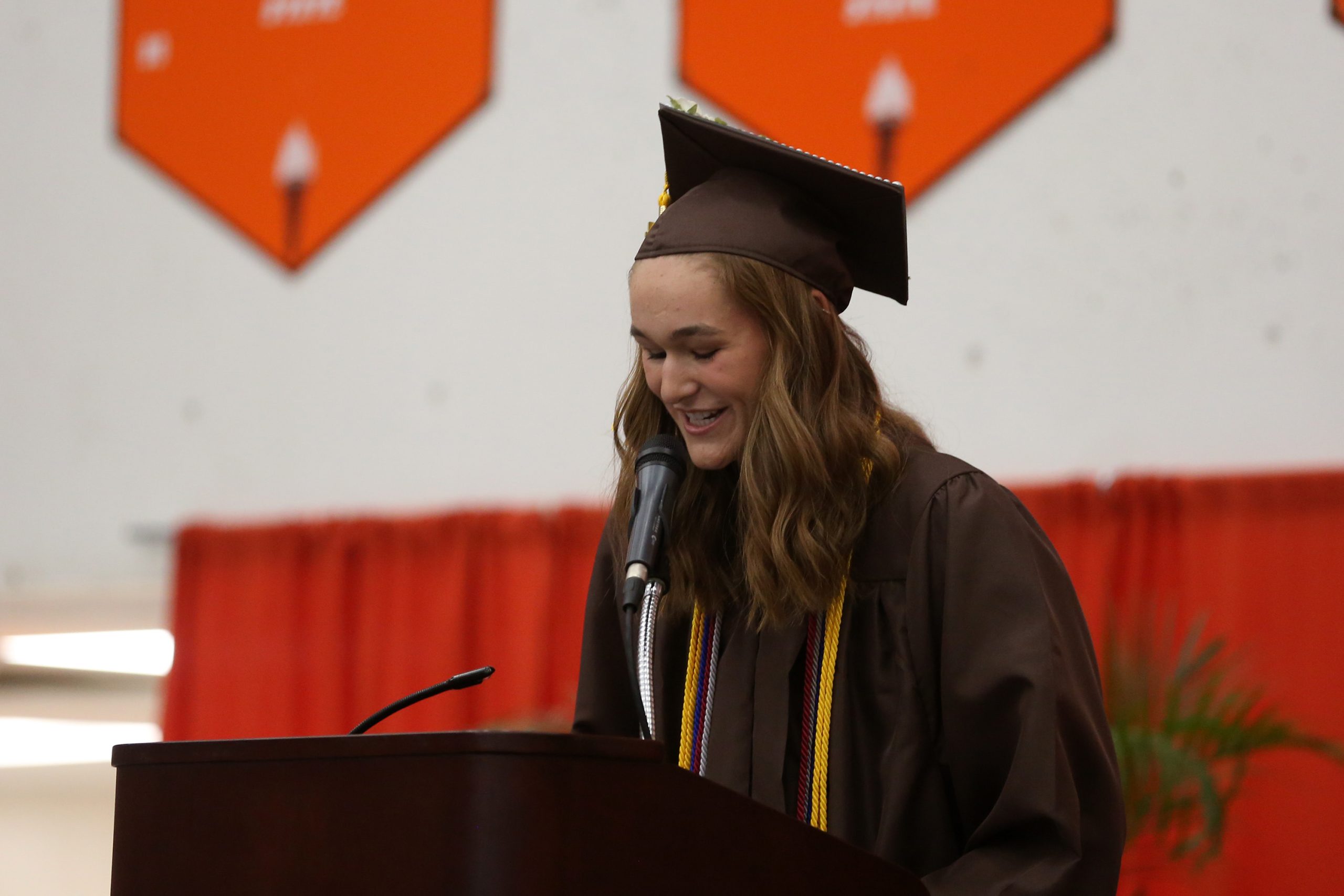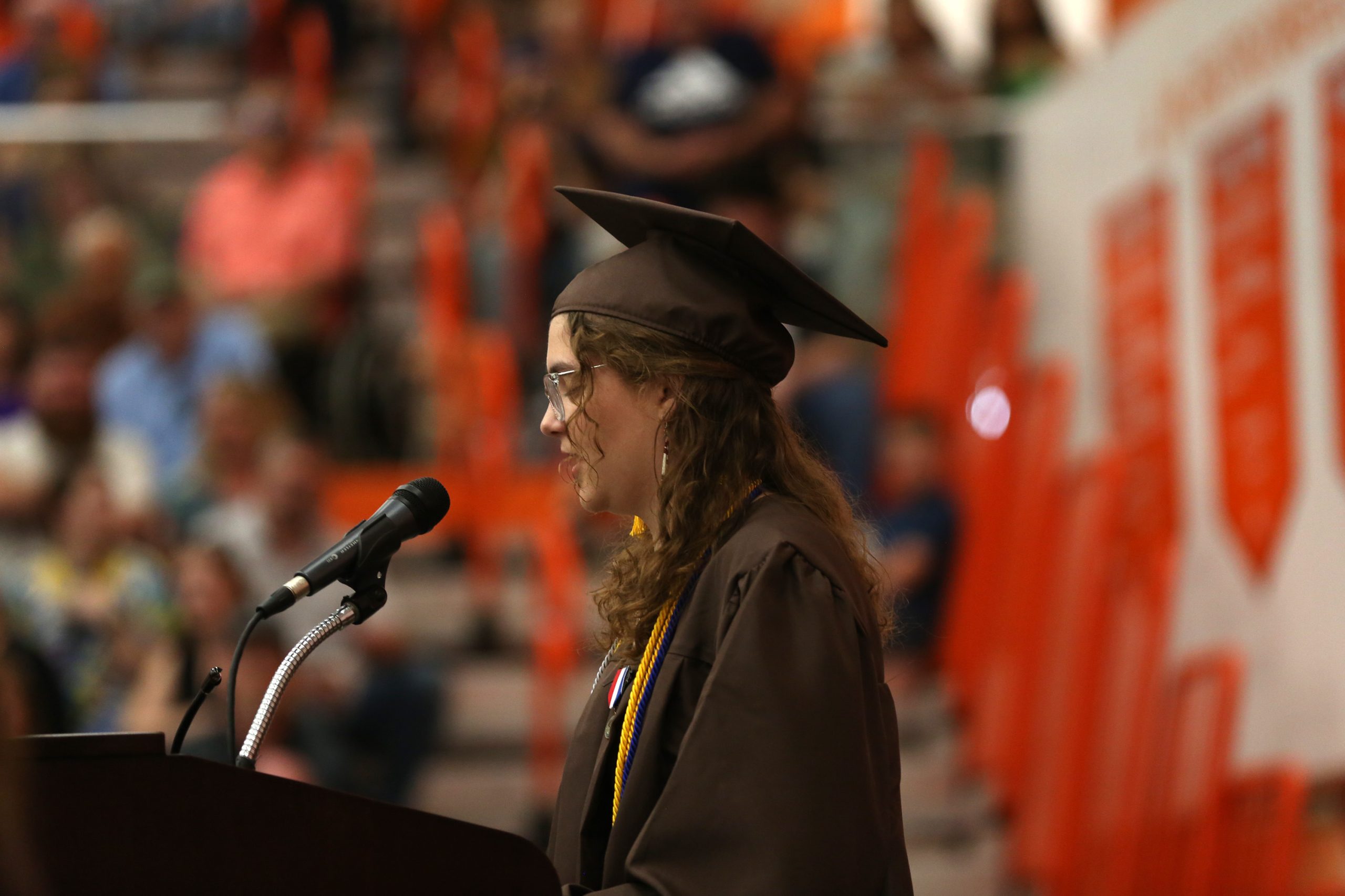 Carla Clark | For The Republic Greta Hemmerlein, valedictorian, speaks during the 51st Annual Commencement of Columbus East High School, Columbus, Ind., Saturday, May 25, 2024.