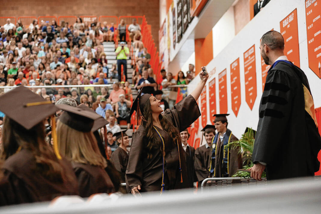 Carla Clark | For The Republic Anna Asher takes a selfie after she receives her diploma during the 51st Annual Commencement of Columbus East High School, Columbus, Ind., Saturday, May 25, 2024.