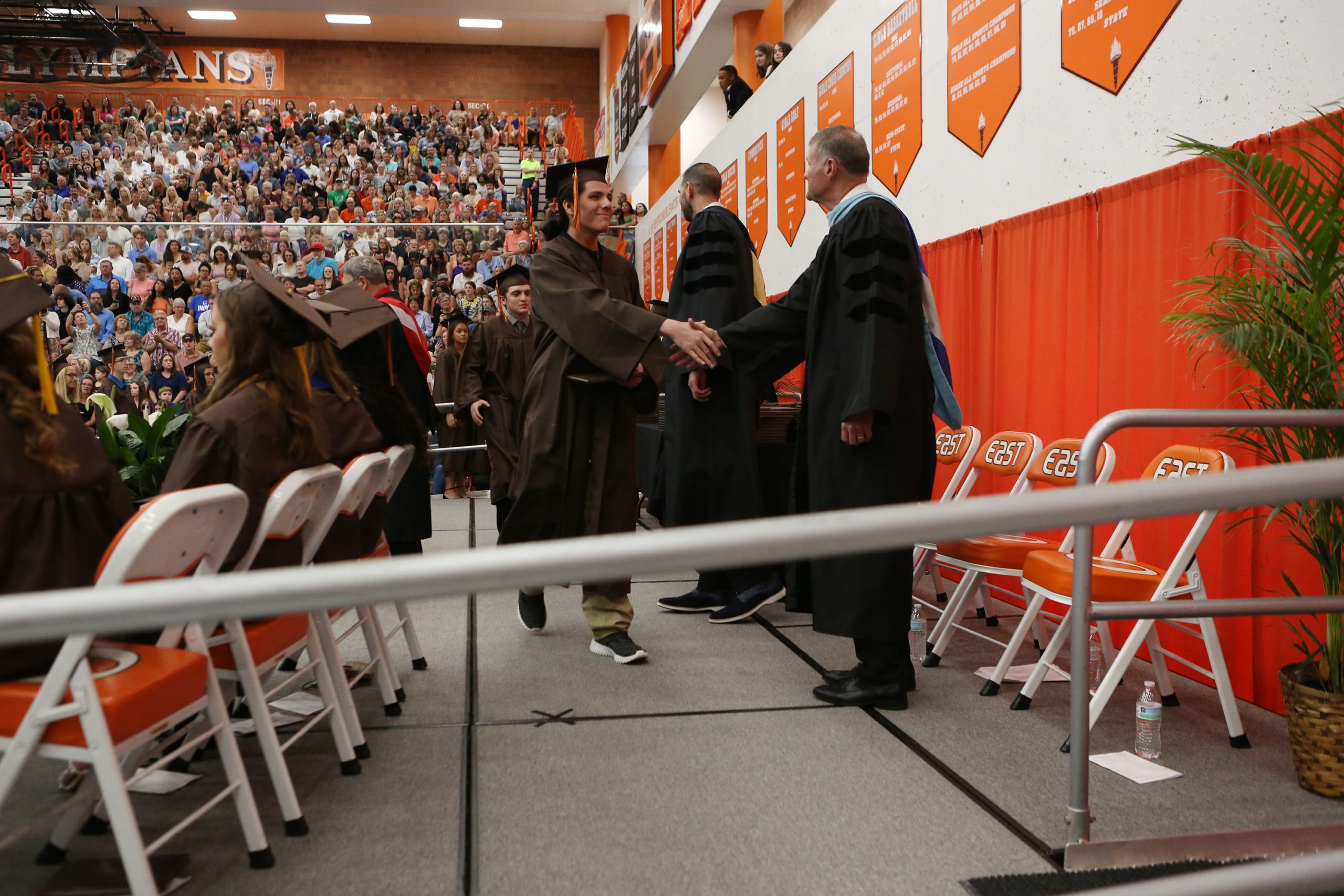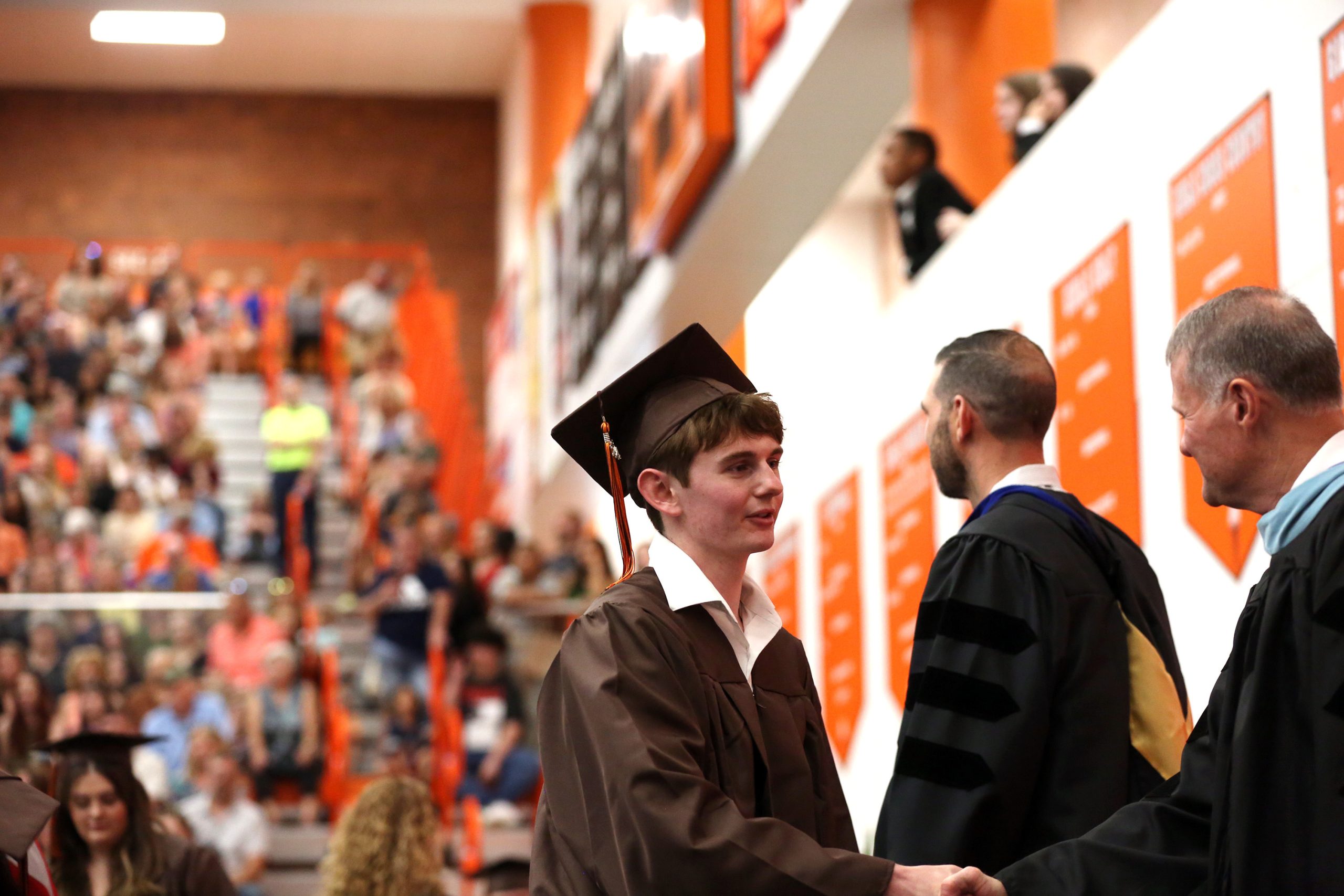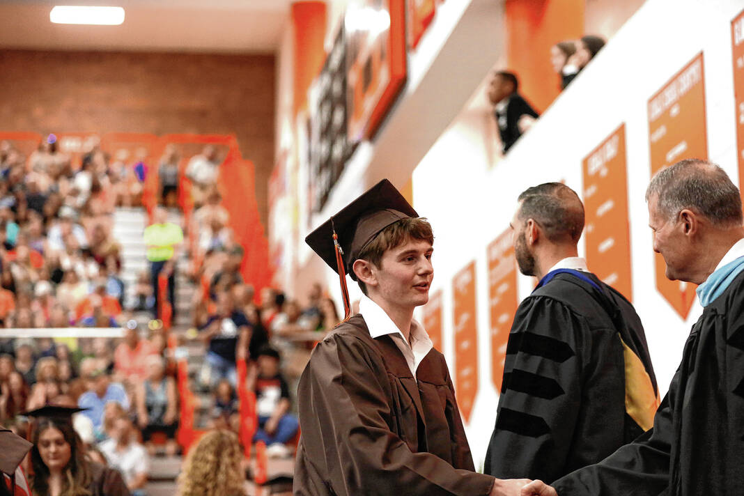 Carla Clark | For The Republic Bo Westhafer Crough shakes hands with Dr. Jim Roberts during the 51st Annual Commencement of Columbus East High School, Columbus, Ind., Saturday, May 25, 2024.