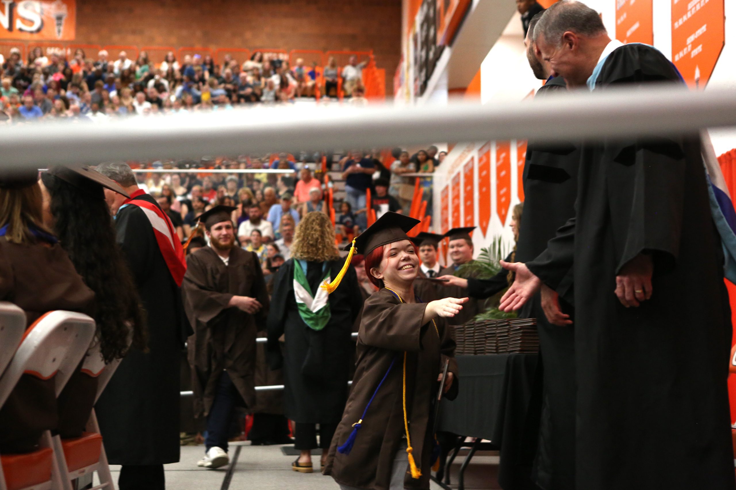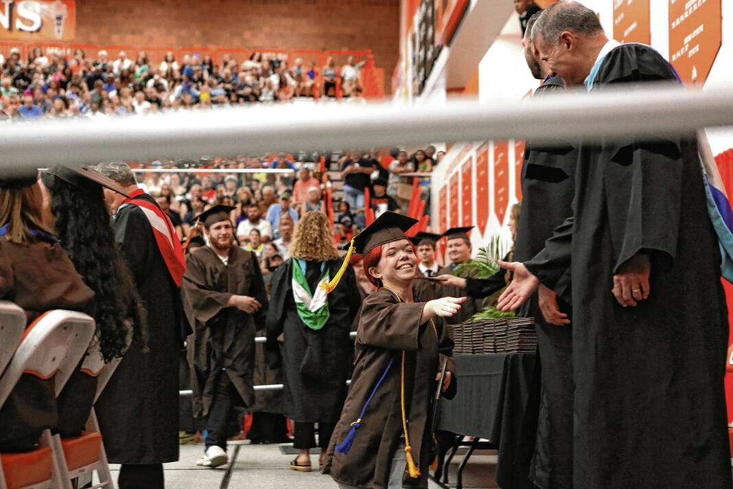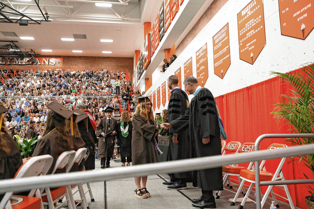 Carla Clark | For The Republic Hannah Gladden shakes hands with Dr. Jim Roberts during the 51st Annual Commencement of Columbus East High School, Columbus, Ind., Saturday, May 25, 2024.