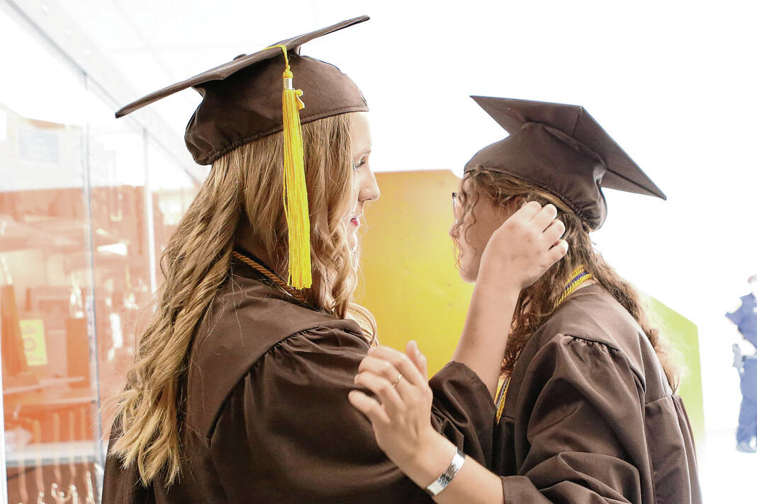 Carla Clark | For The Republic Julia Beckort and Erin Walters get ready during the 51st Annual Commencement of Columbus East High School, Columbus, Ind., Saturday, May 25, 2024.
