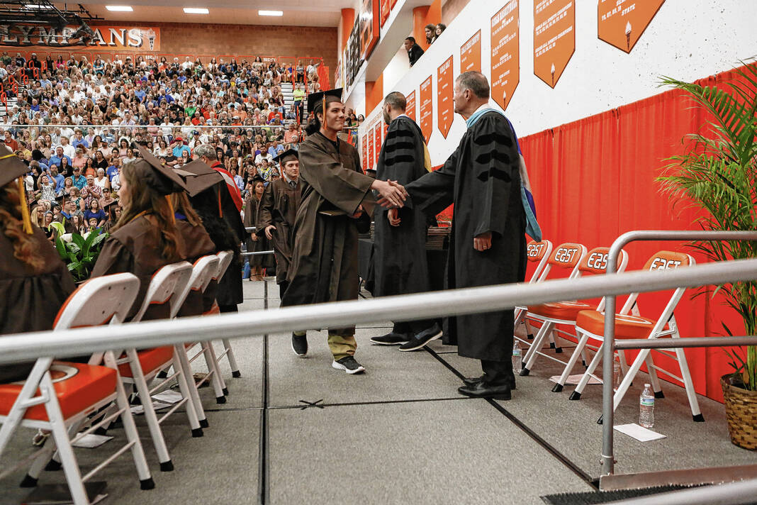 Carla Clark | For The Republic Johnathan Ismael De La Cruz shakes hands with Dr. Jim Roberts during the 51st Annual Commencement of Columbus East High School, Columbus, Ind., Saturday, May 25, 2024.