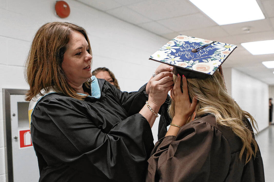 Carla Clark | For The Republic Jennifer Steinwedel secures the mortarboard of MacKenzie Bailey with bobby pins during the 51st Annual Commencement of Columbus East High School, Columbus, Ind., Saturday, May 25, 2024.