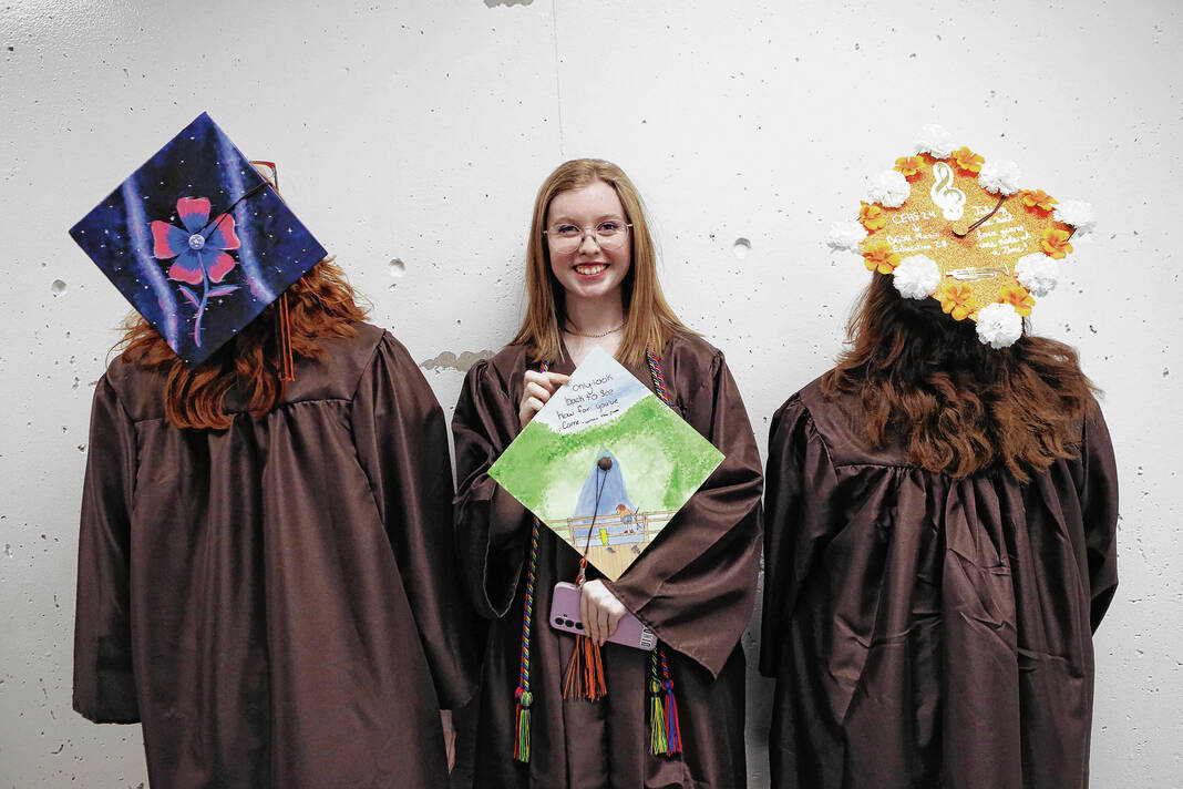 Carla Clark | For The Republic Mia Hess, Allyson Herold, and Madison Valentine with their decorated mortarboards during the 51st Annual Commencement of Columbus East High School, Columbus, Ind., Saturday, May 25, 2024.