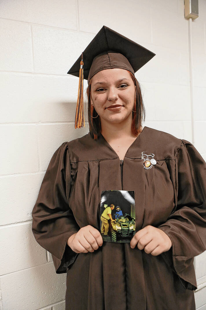 Carla Clark | For The Republic Willow Gambill wears a pin and has a photo to go in her mortarboard of her Papaw Jerry Maley, who passed away in December, so he could be with her during the 51st Annual Commencement of Columbus East High School, Columbus, Ind., Saturday, May 25, 2024.