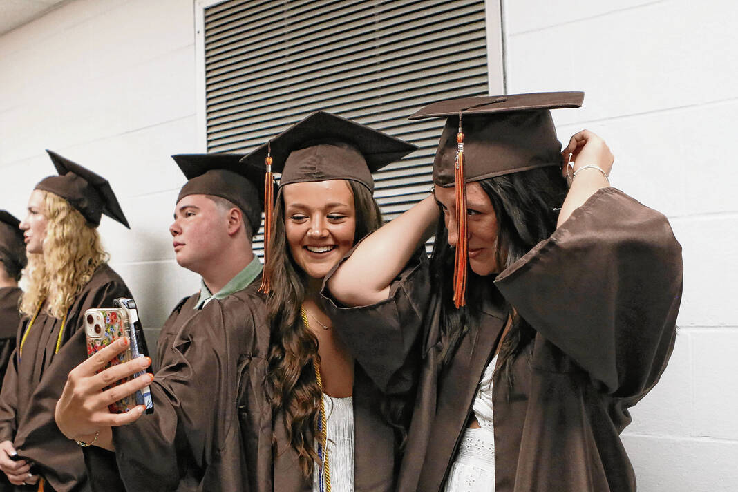 Carla Clark | For The Republic Anna Asher, second from right, and Lily Asher, at right, use their phone as a mirror to get ready during the 51st Annual Commencement of Columbus East High School, Columbus, Ind., Saturday, May 25, 2024.