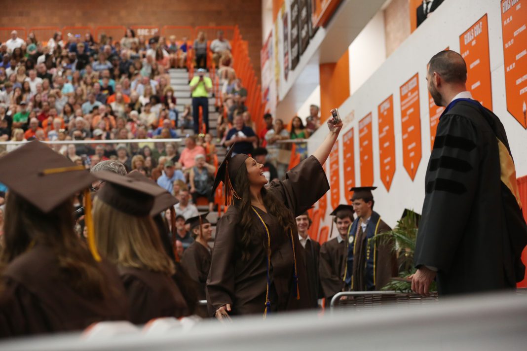 Carla Clark | For The Republic Anna Asher takes a selfie after she receives her diploma during the Fifty-First Annual Commencement of Columbus East High School, Columbus, Ind., Saturday, May 25, 2024.