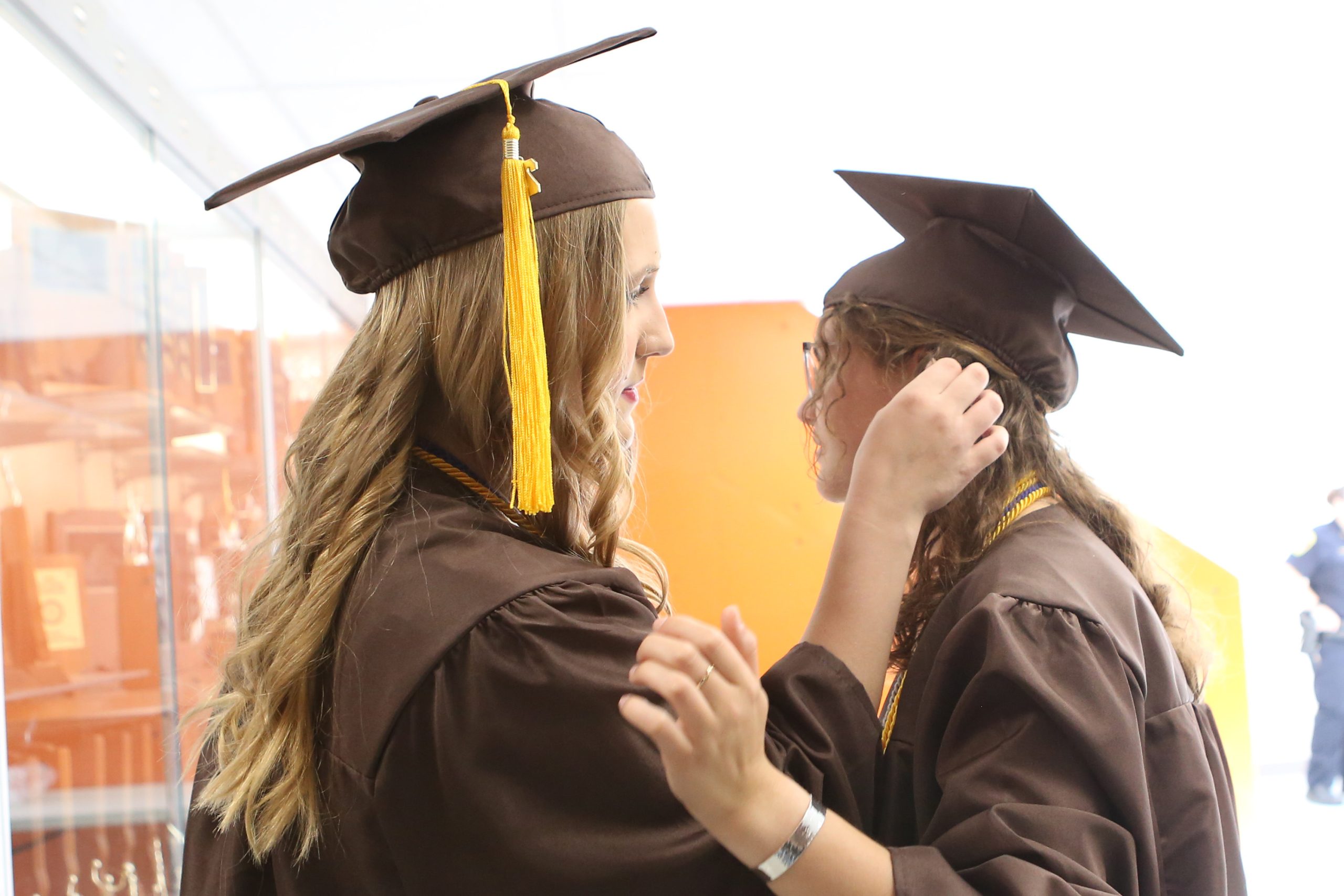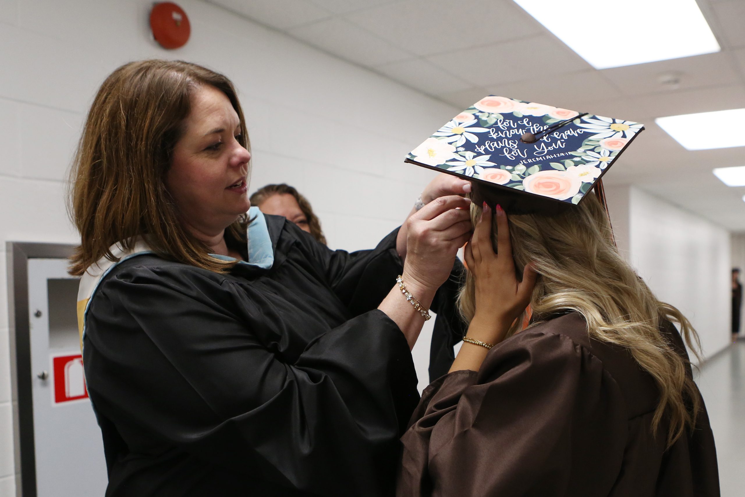 Carla Clark | For The Republic Jennifer Steinwedel secures the mortarboard of MacKenzie Bailey with bobby pins during the Fifty-First Annual Commencement of Columbus East High School, Columbus, Ind., Saturday, May 25, 2024.