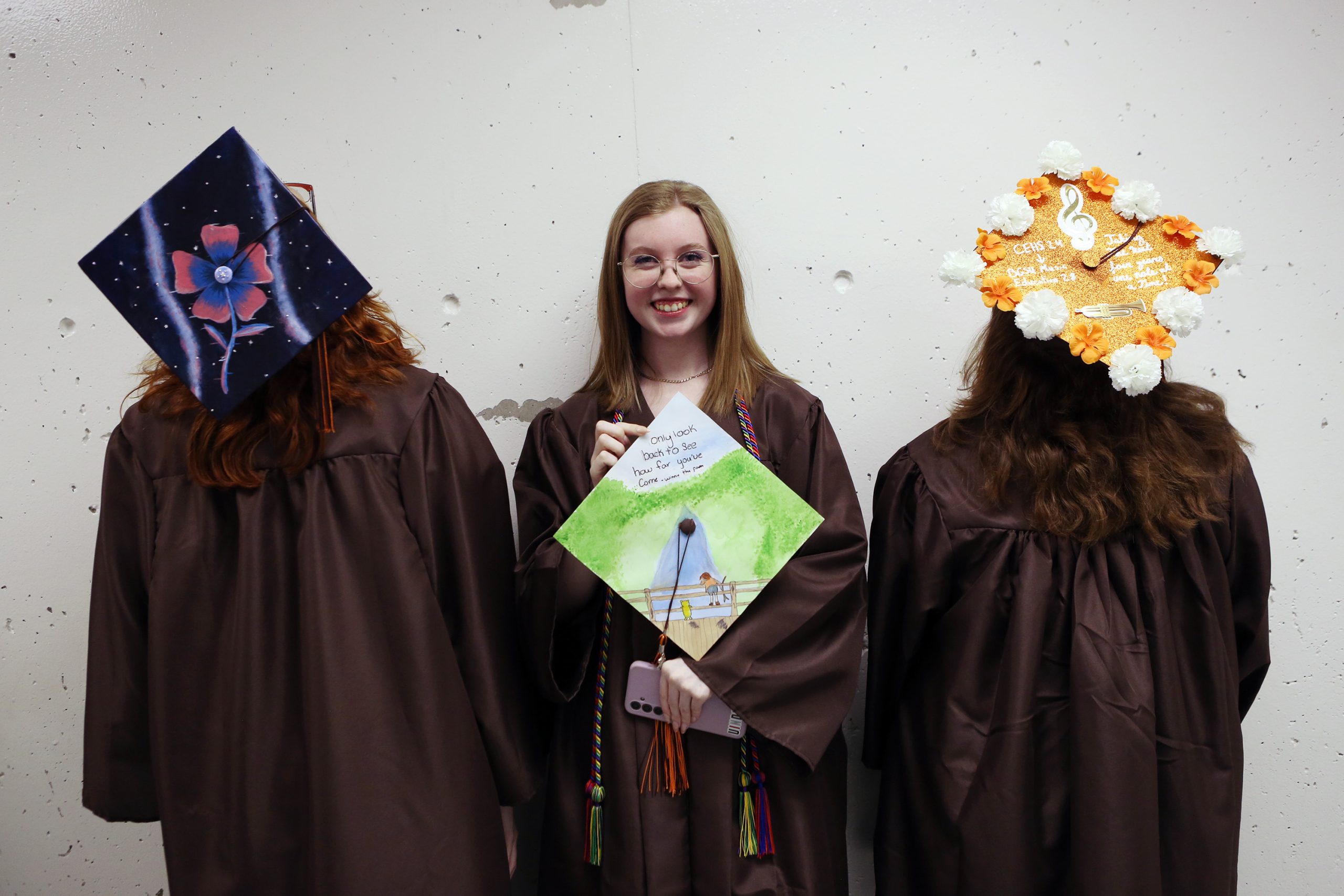 Carla Clark | For The Republic Mia Hess, Allyson Herold, and Madison Valentine with their decorated mortarboards during the Fifty-First Annual Commencement of Columbus East High School, Columbus, Ind., Saturday, May 25, 2024.