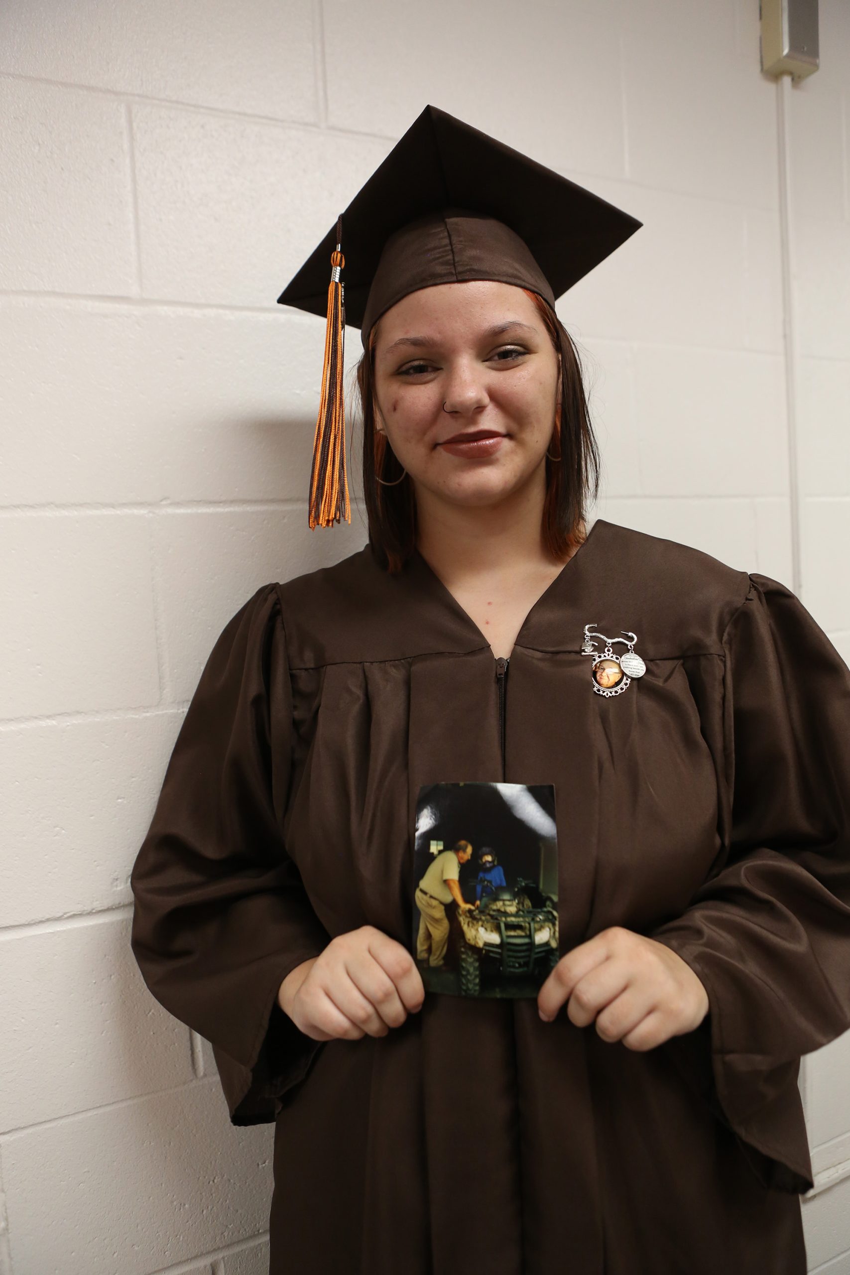 Carla Clark | For The Republic Willow Gambill wears a pin and has a photo to go in her mortarboard of her Papaw Jerry Maley, who passed away in December, so he could be with her during the Fifty-First Annual Commencement of Columbus East High School, Columbus, Ind., Saturday, May 25, 2024.