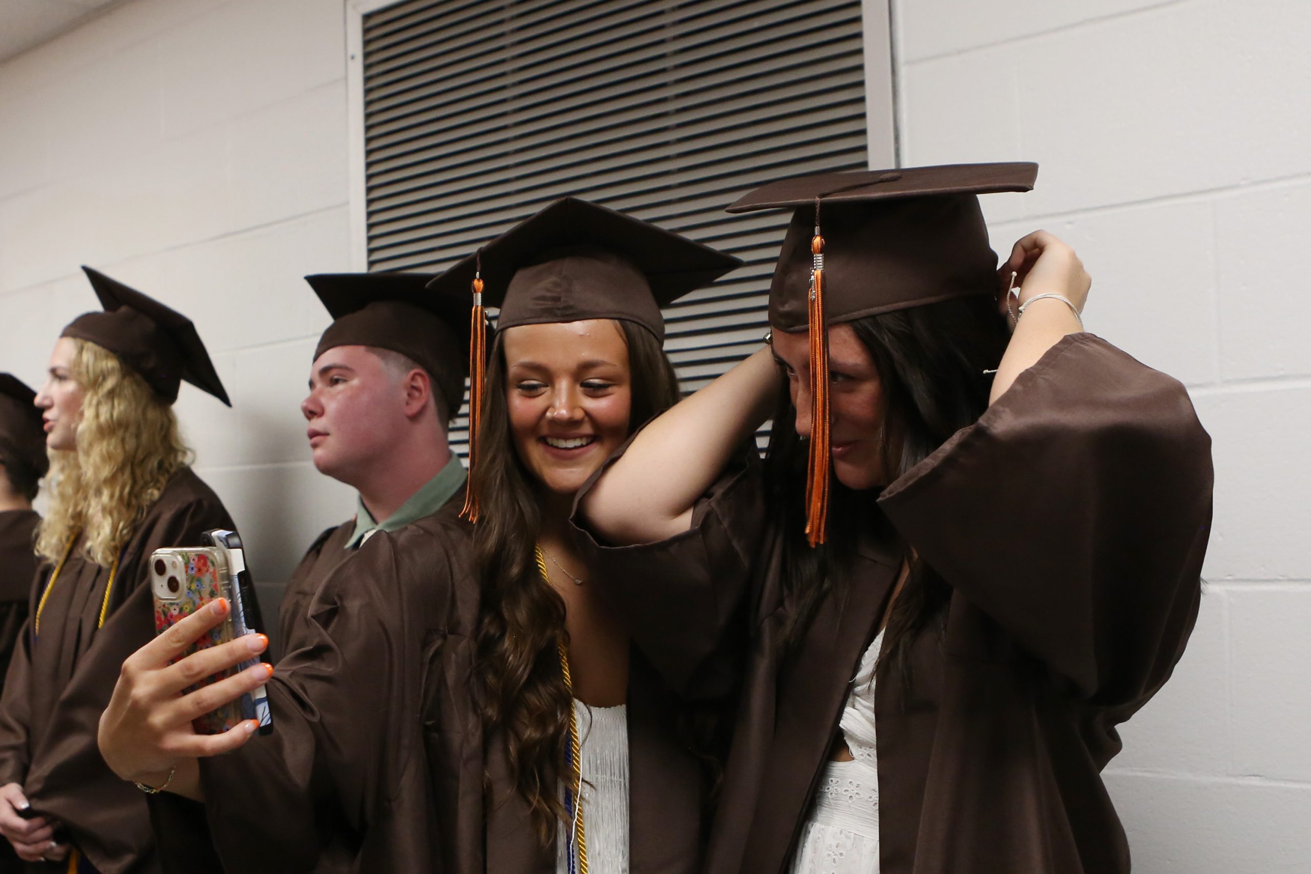 Carla Clark | For The Republic Anna Asher, second from right, and Lily Asher, at right, use their phone as a mirror to get ready during the Fifty-First Annual Commencement of Columbus East High School, Columbus, Ind., Saturday, May 25, 2024.