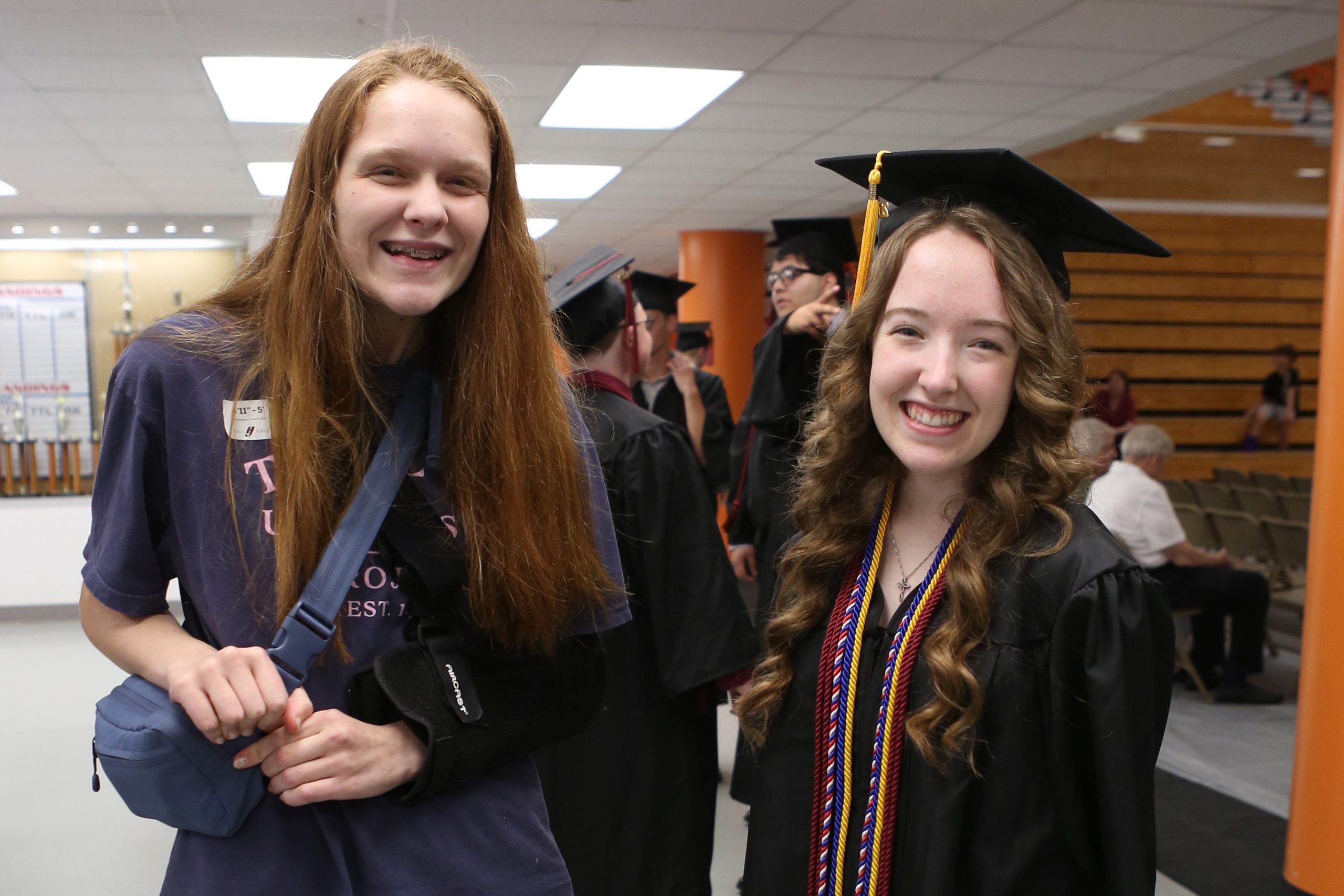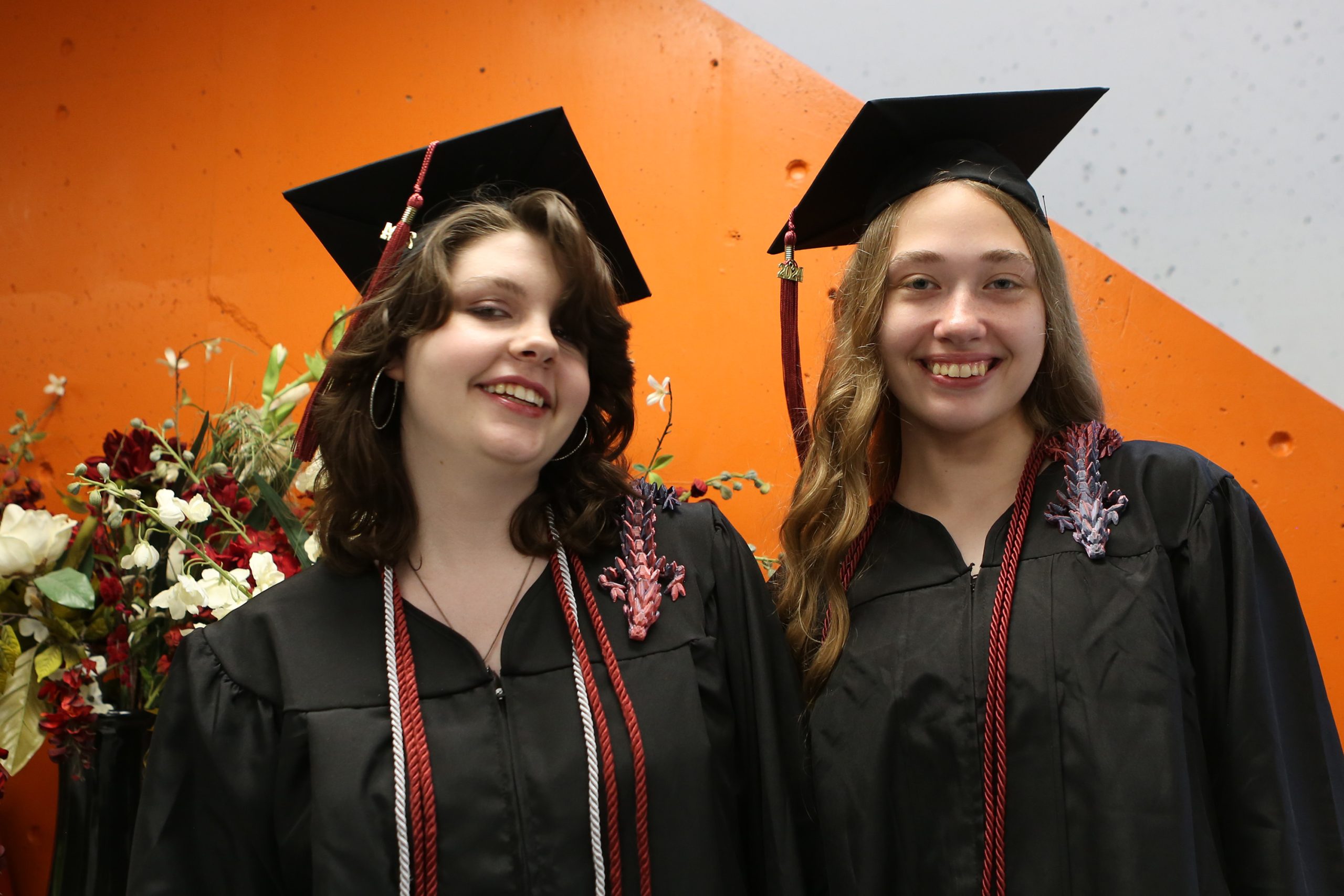 Annalace Wright and Savannah Shreve pose for a photograph. Wright and Shreve, who is graduating as a Junior, will be college roommates in the fall. Photo taken during the CSA New Tech Commencement Ceremony at Columbus East High School, Columbus, Ind., Friday, May 24, 2024.