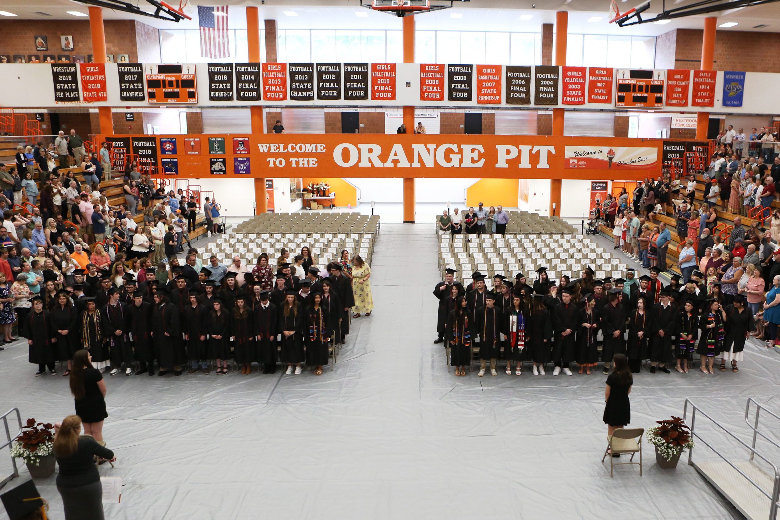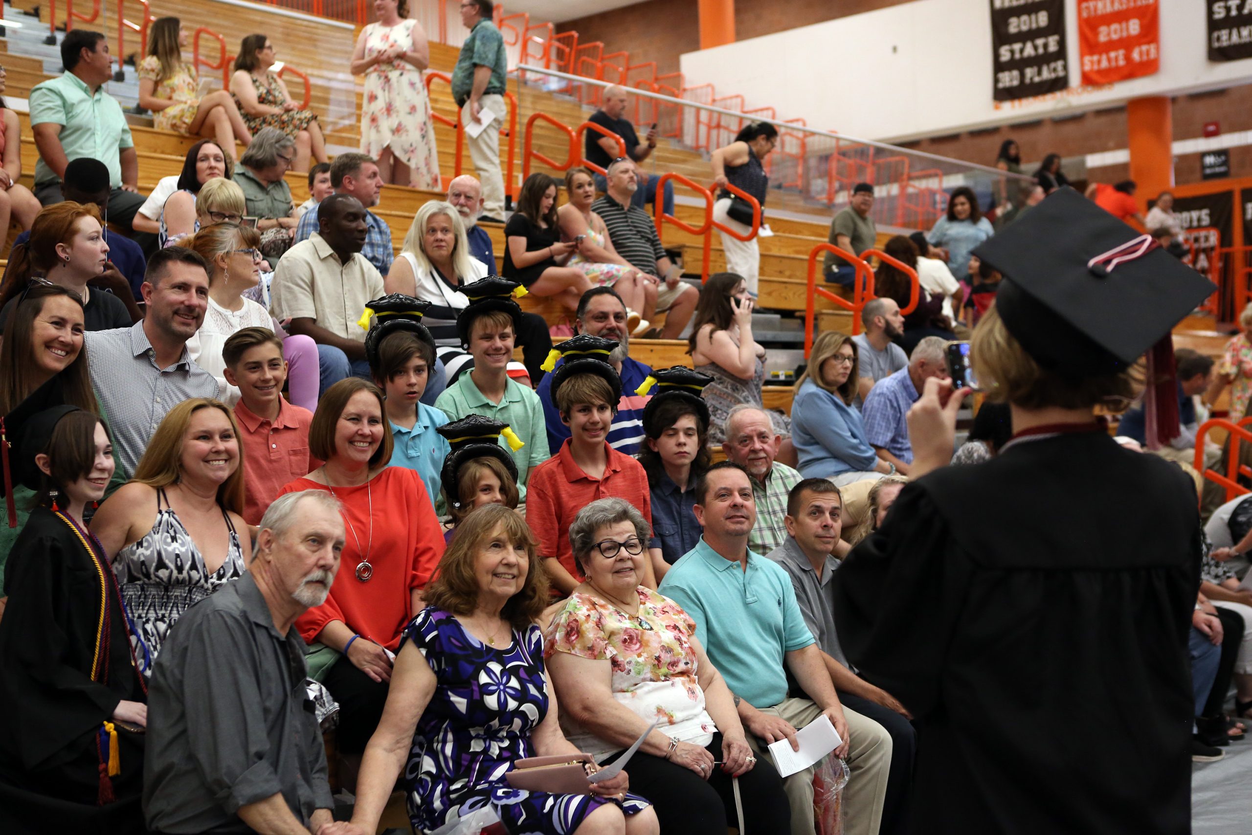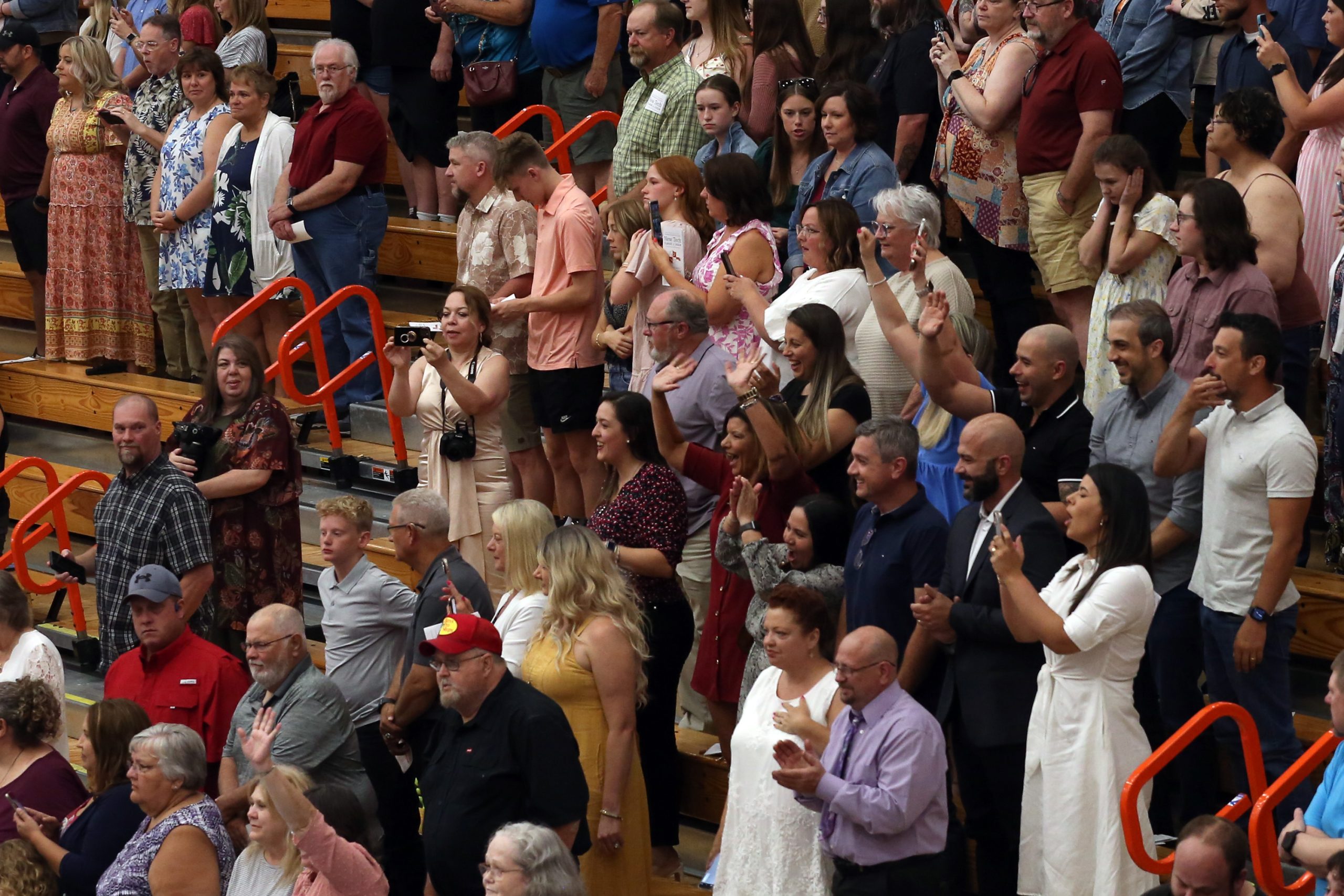 Family and friends cheer and take photos during the graduates procession into the gym during the CSA New Tech Commencement Ceremony at Columbus East High School, Columbus, Ind., Friday, May 24, 2024.