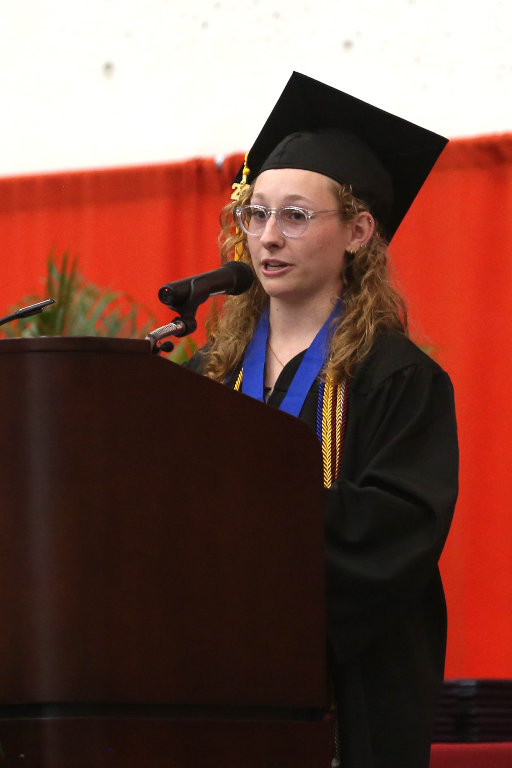 Sophie Rafferty gives the student welcome during the CSA New Tech Commencement Ceremony at Columbus East High School, Columbus, Ind., Friday, May 24, 2024.