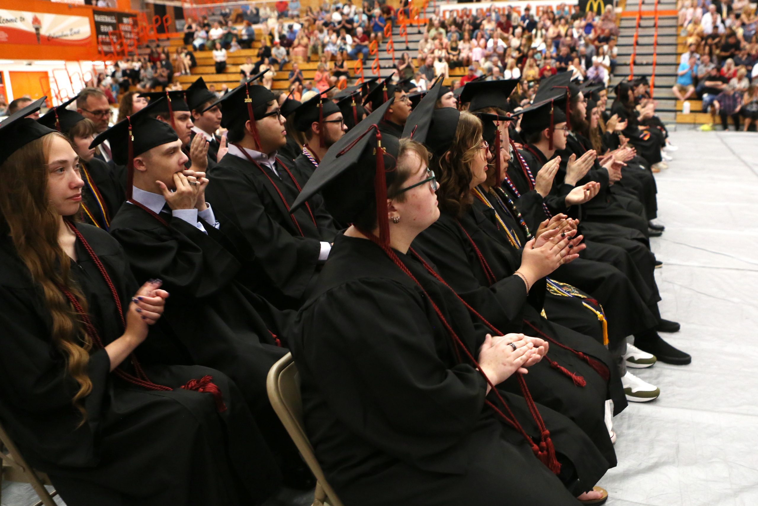Graduates applaud remarks by the speaker during the CSA New Tech Commencement Ceremony at Columbus East High School, Columbus, Ind., Friday, May 24, 2024.