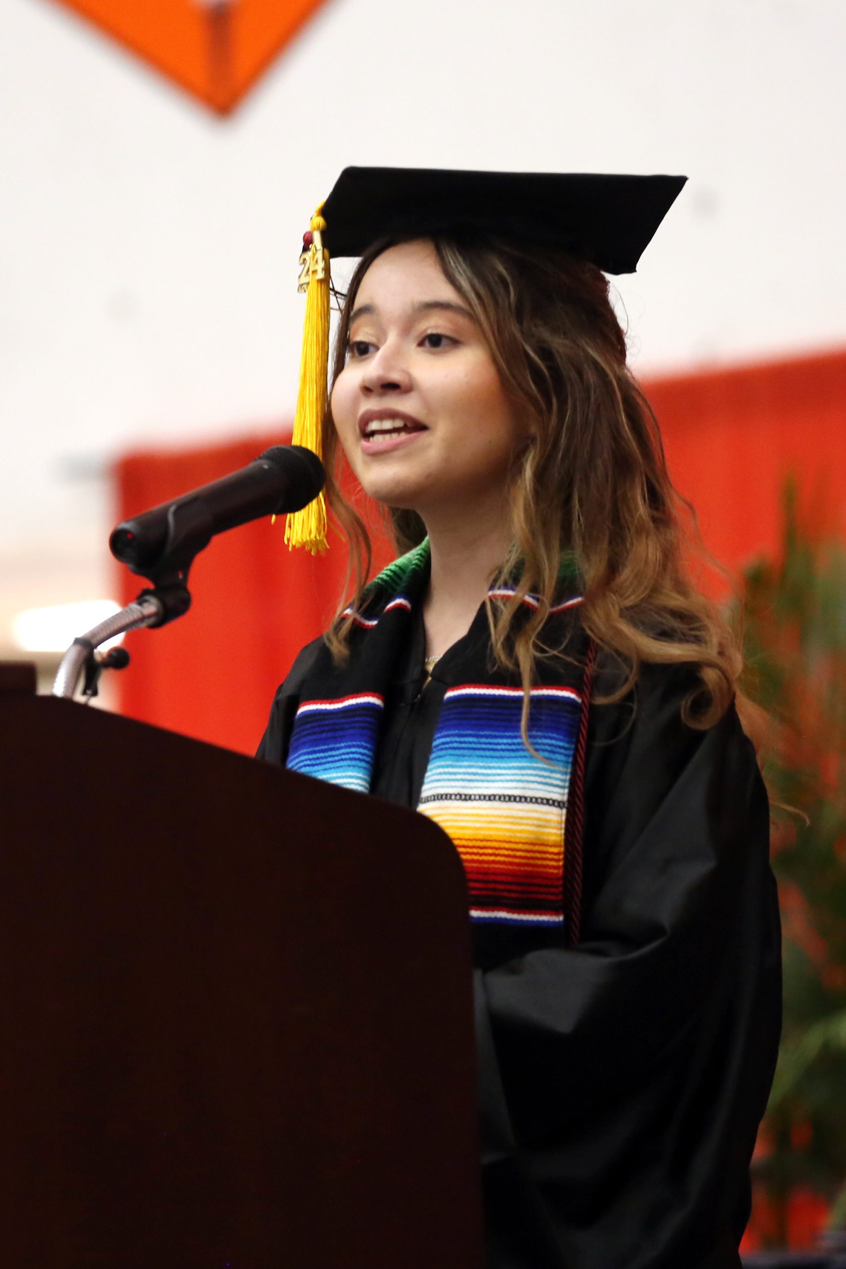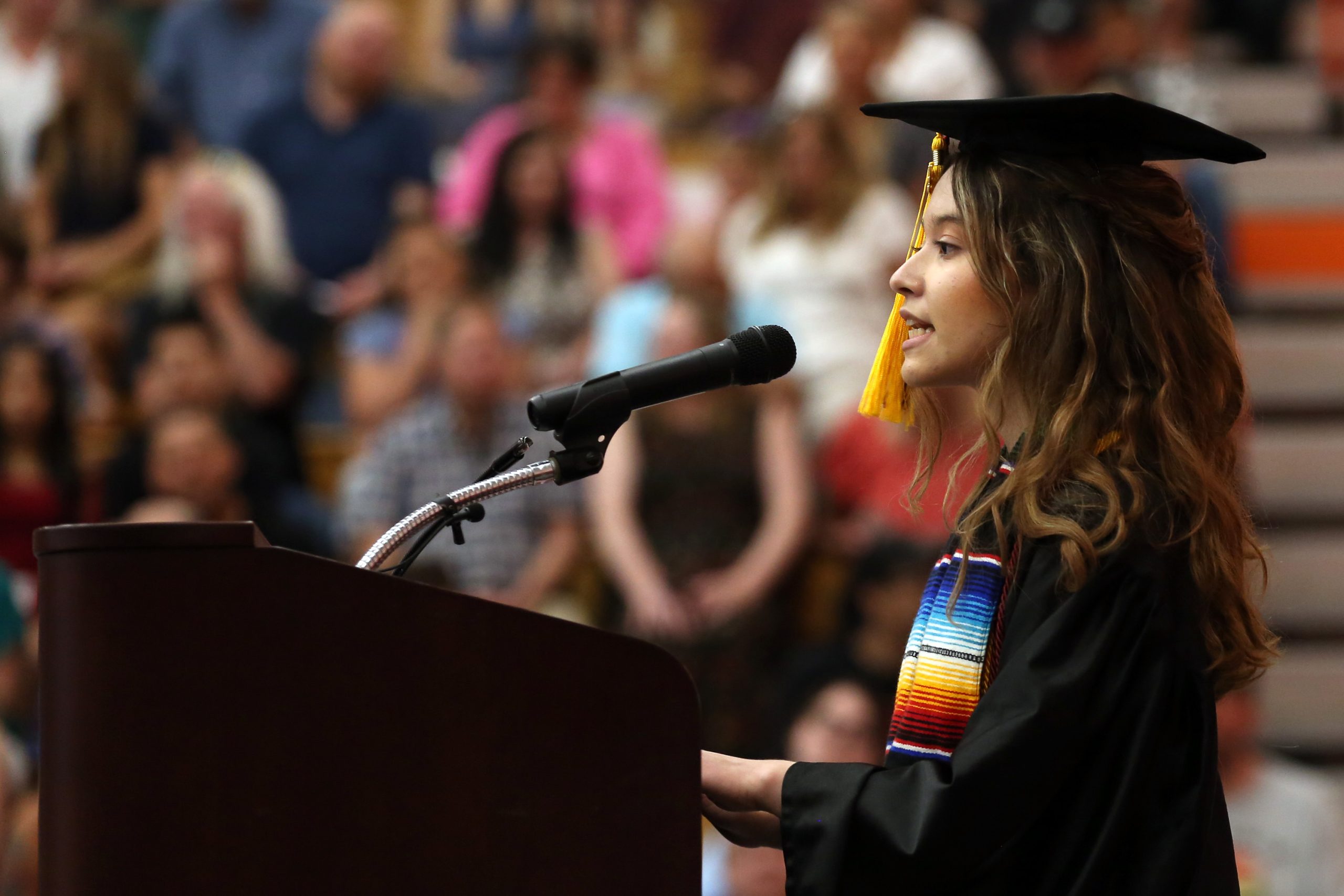 Janelly Villalobos gives the student farewell during the CSA New Tech Commencement Ceremony at Columbus East High School, Columbus, Ind., Friday, May 24, 2024.
