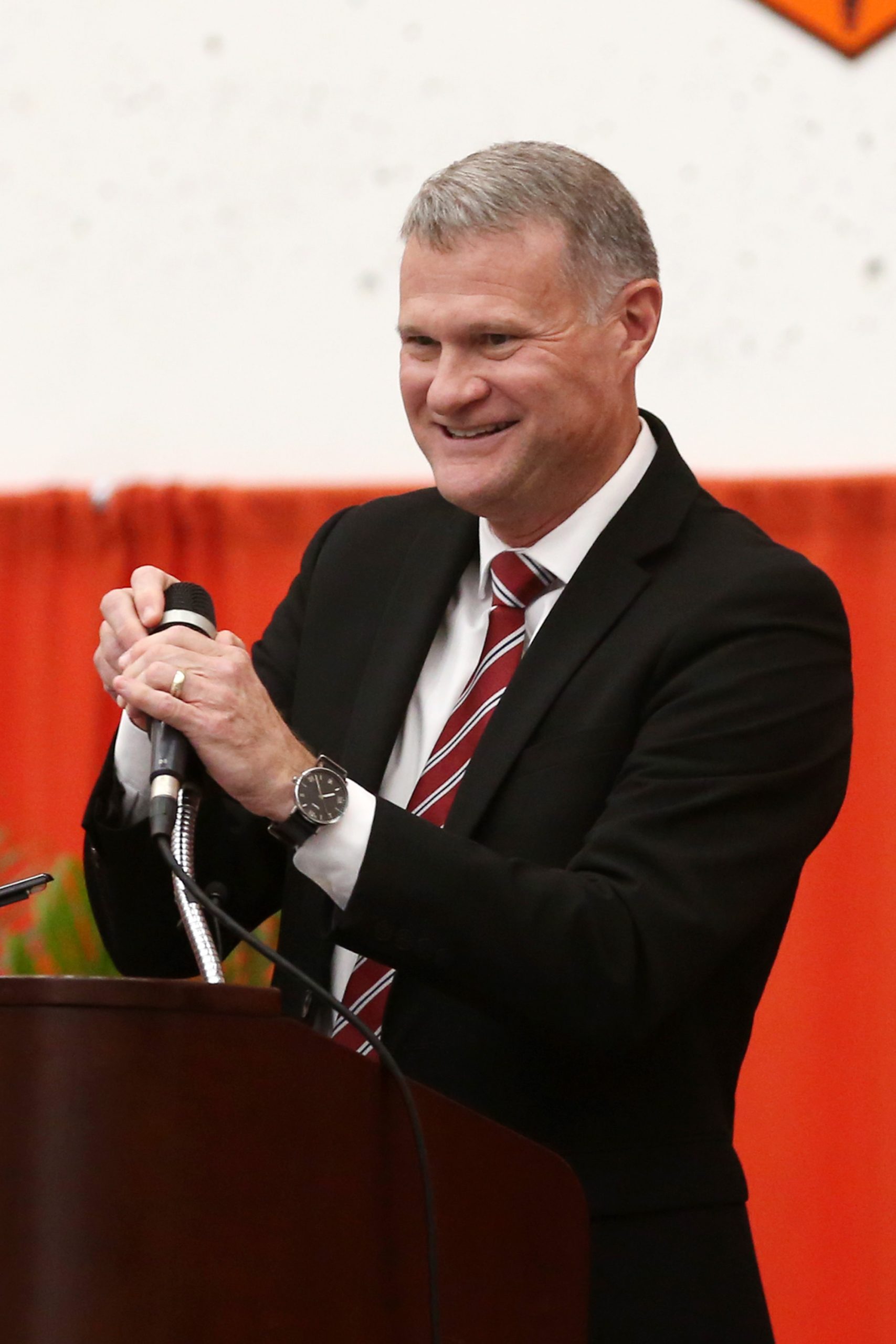 Dr. Jim Roberts smiles as he fixes the microphone during the CSA New Tech Commencement Ceremony at Columbus East High School, Columbus, Ind., Friday, May 24, 2024.