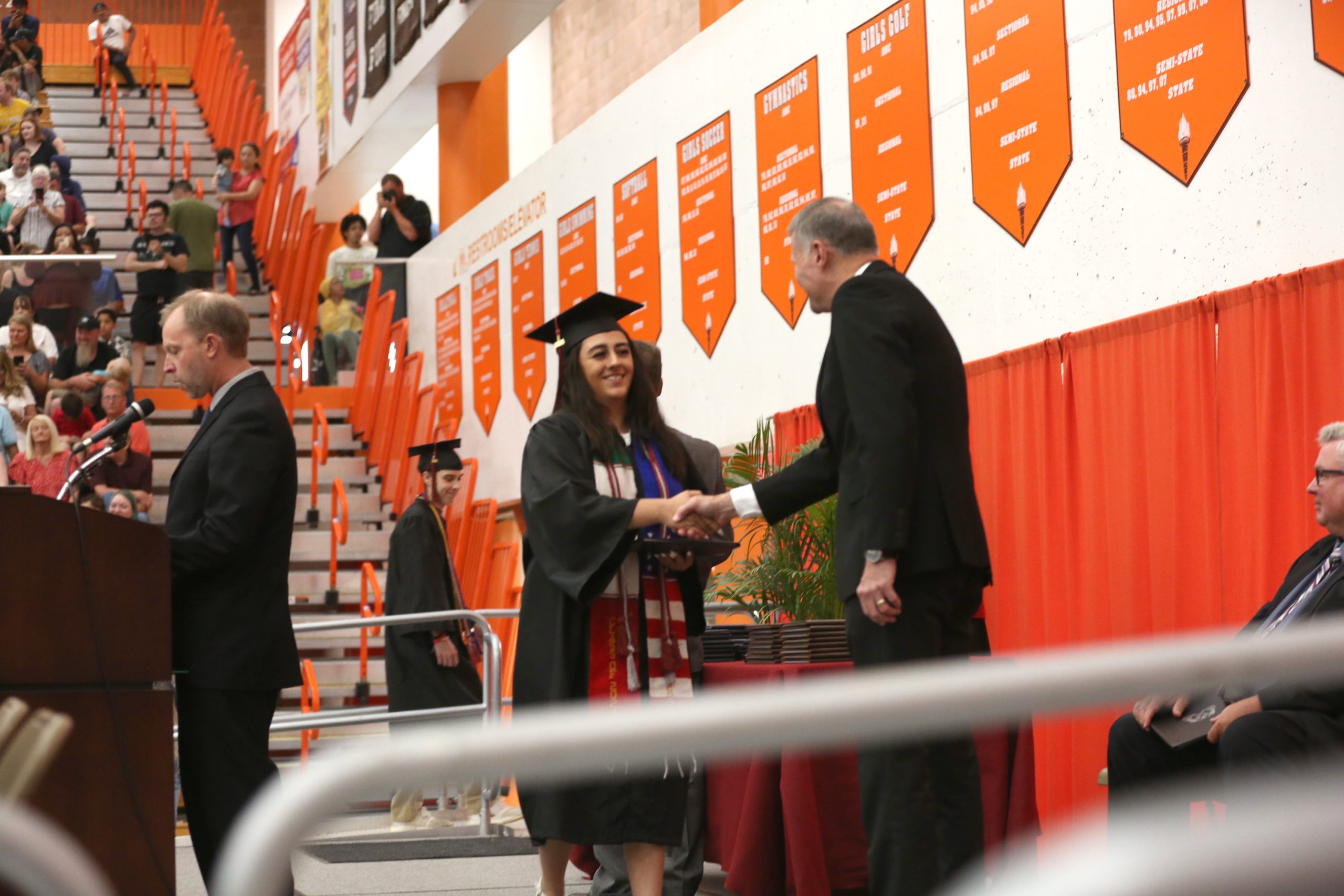 Andrianna Lynn Bustos shakes the hand of Dr. Jim Roberts during the CSA New Tech Commencement Ceremony at Columbus East High School, Columbus, Ind., Friday, May 24, 2024.
