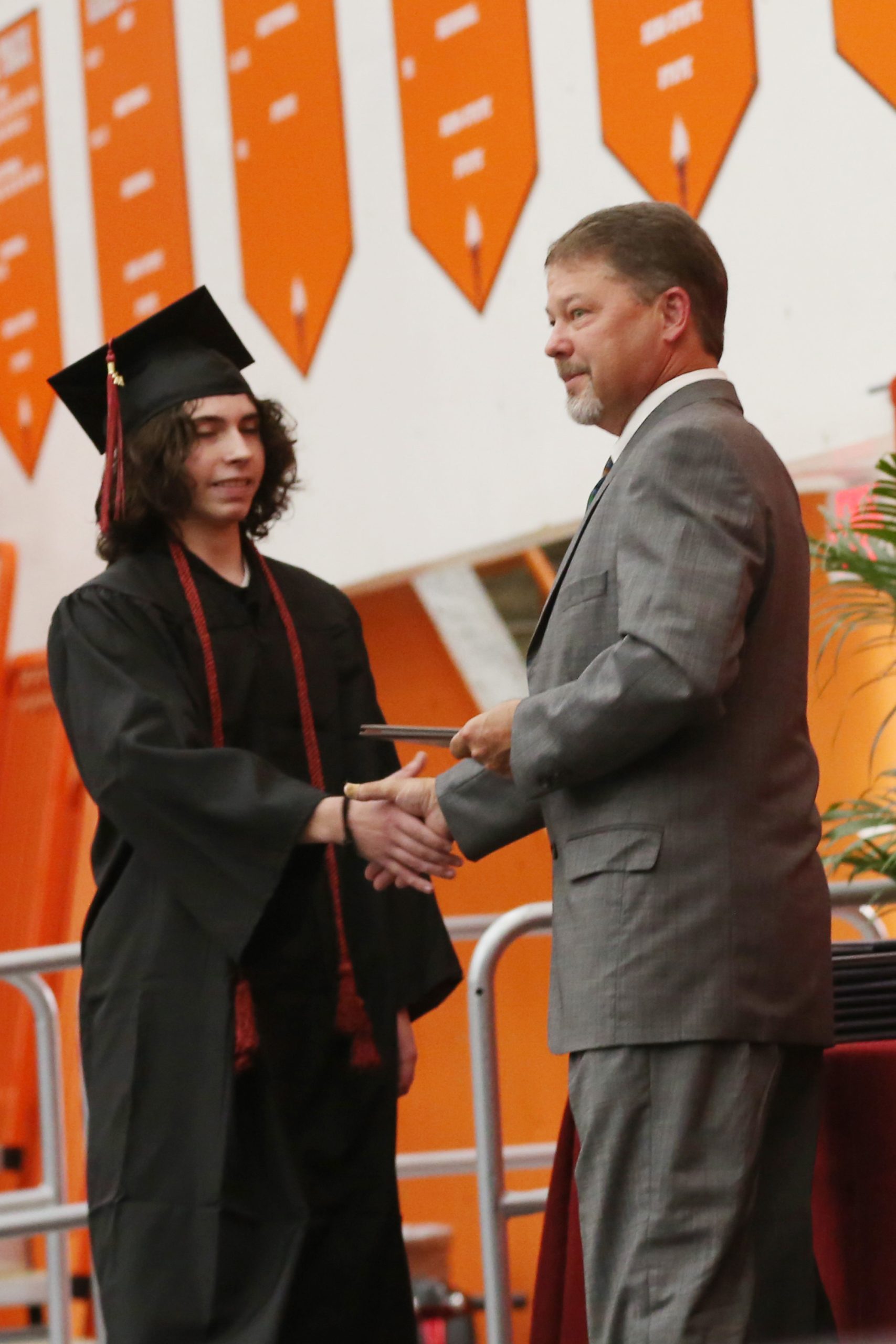 Logan Dulong receives his diploma from Principal Mike Reed during the CSA New Tech Commencement Ceremony at Columbus East High School, Columbus, Ind., Friday, May 24, 2024.