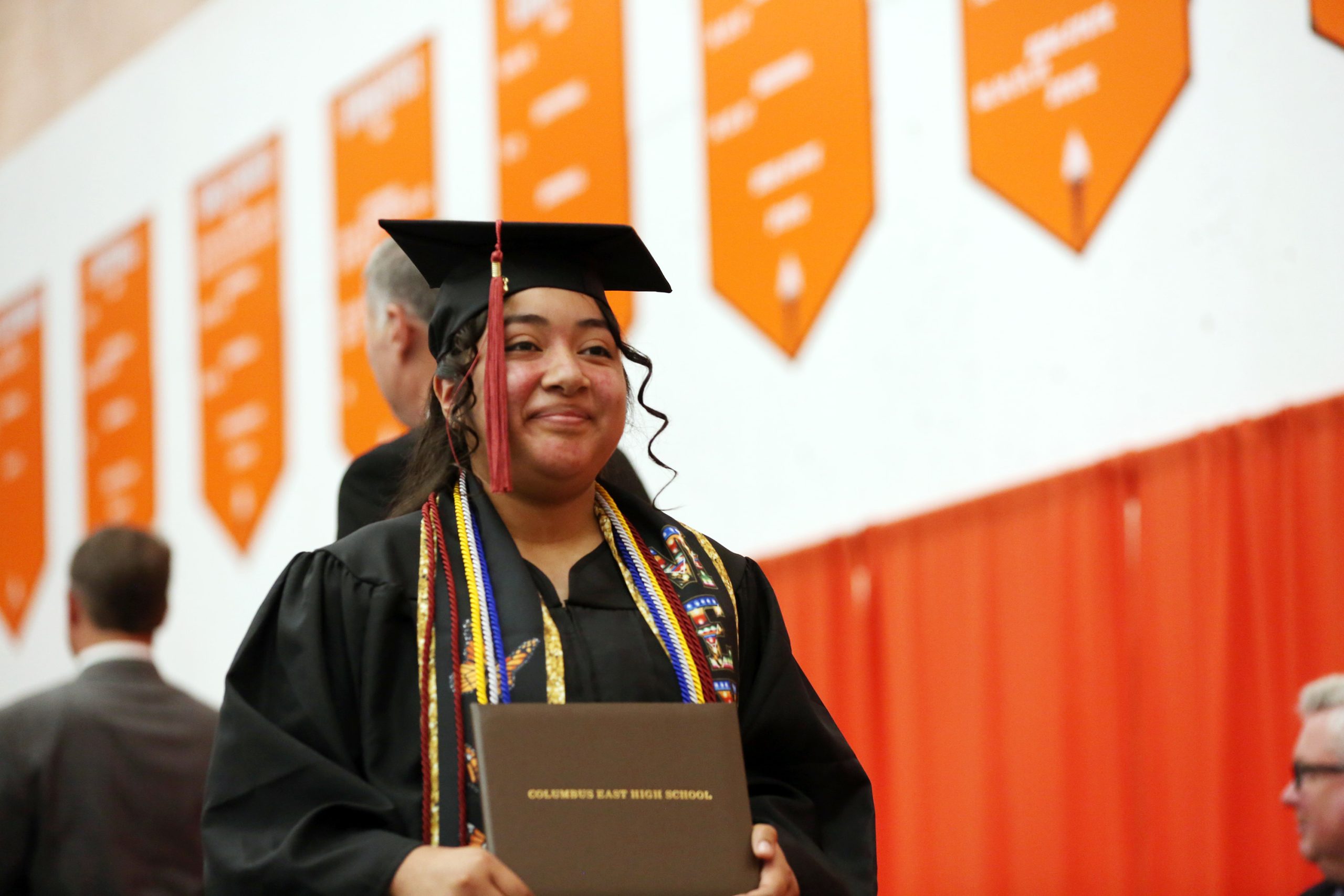 Lesli Flores poses for a photograph with her diiploma during the CSA New Tech Commencement Ceremony at Columbus East High School, Columbus, Ind., Friday, May 24, 2024.