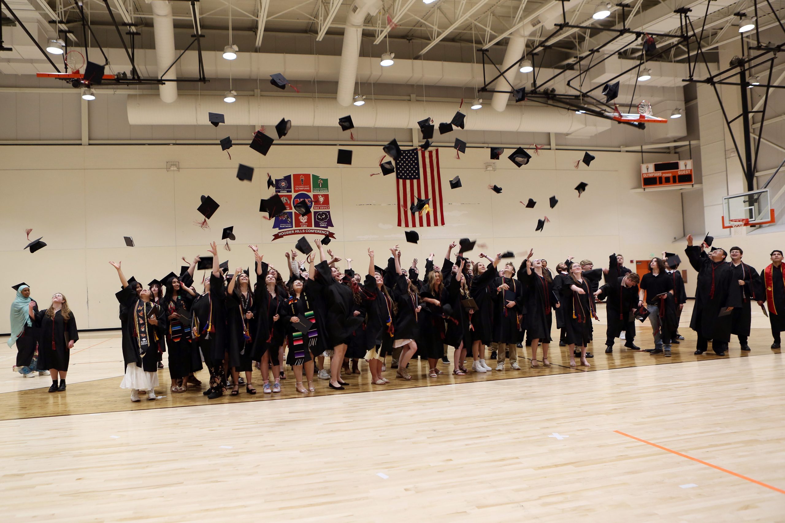 Graduates celebrate with a cap toss during the CSA New Tech Commencement Ceremony at Columbus East High School, Columbus, Ind., Friday, May 24, 2024.