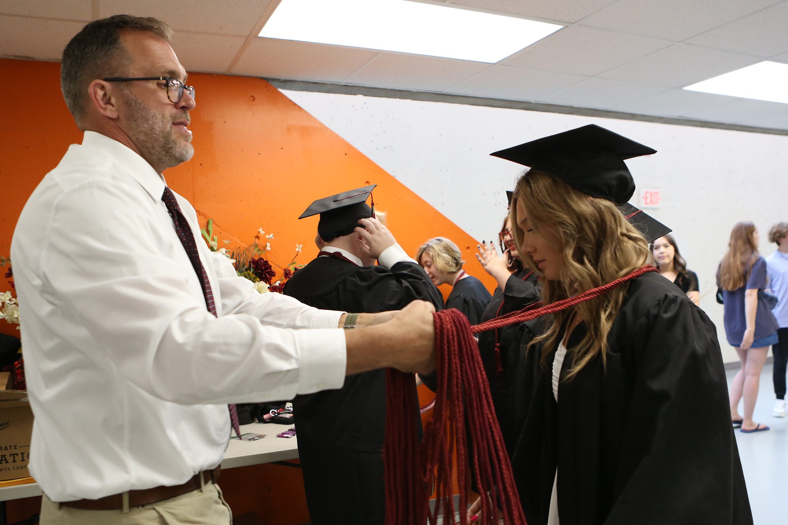 Teacher Matt Morrill gives Ella Howard her tassels during the CSA New Tech Commencement Ceremony at Columbus East High School, Columbus, Ind., Friday, May 24, 2024.
