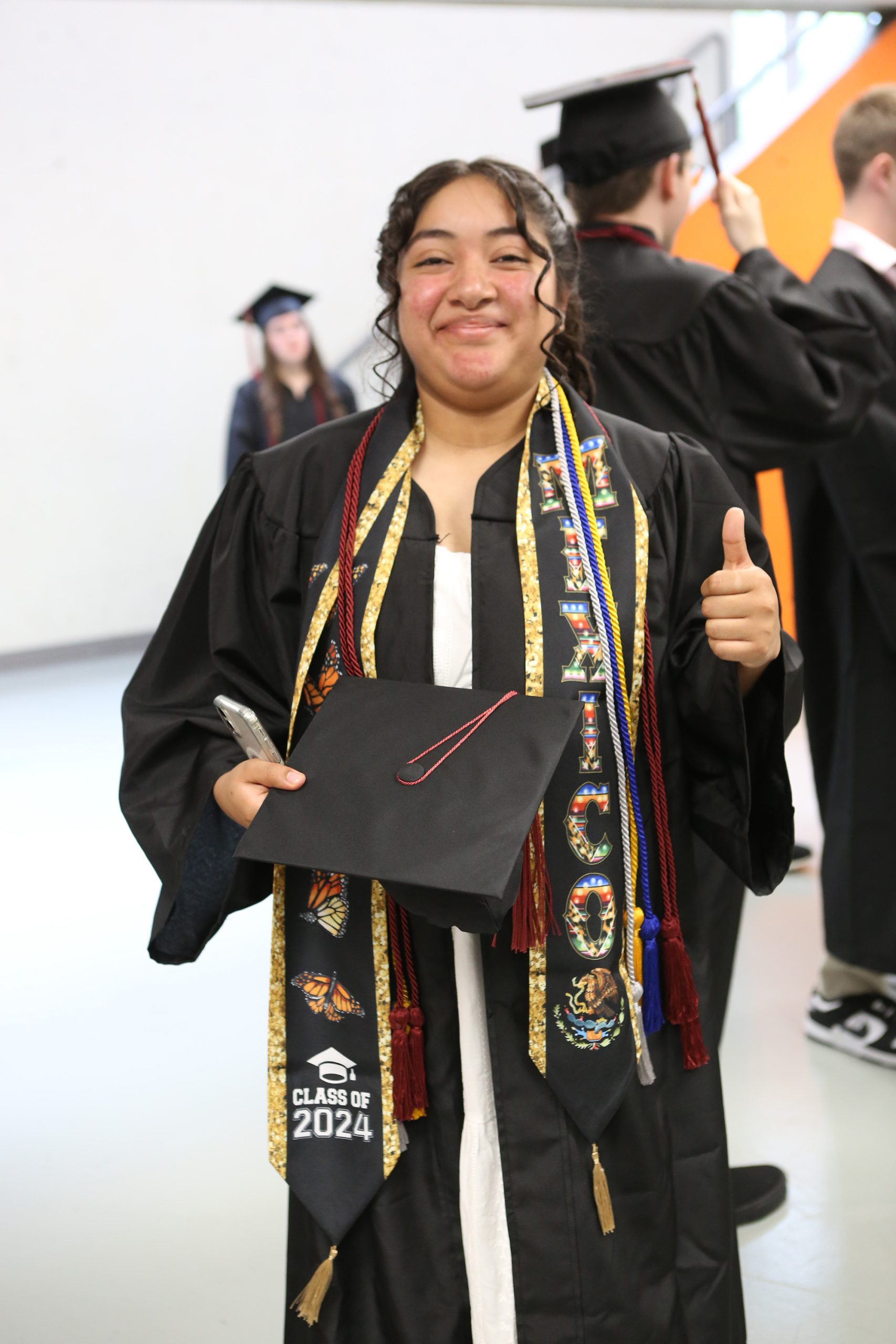 Lesli Flores gives a thumbs up during the CSA New Tech Commencement Ceremony at Columbus East High School, Columbus, Ind., Friday, May 24, 2024.