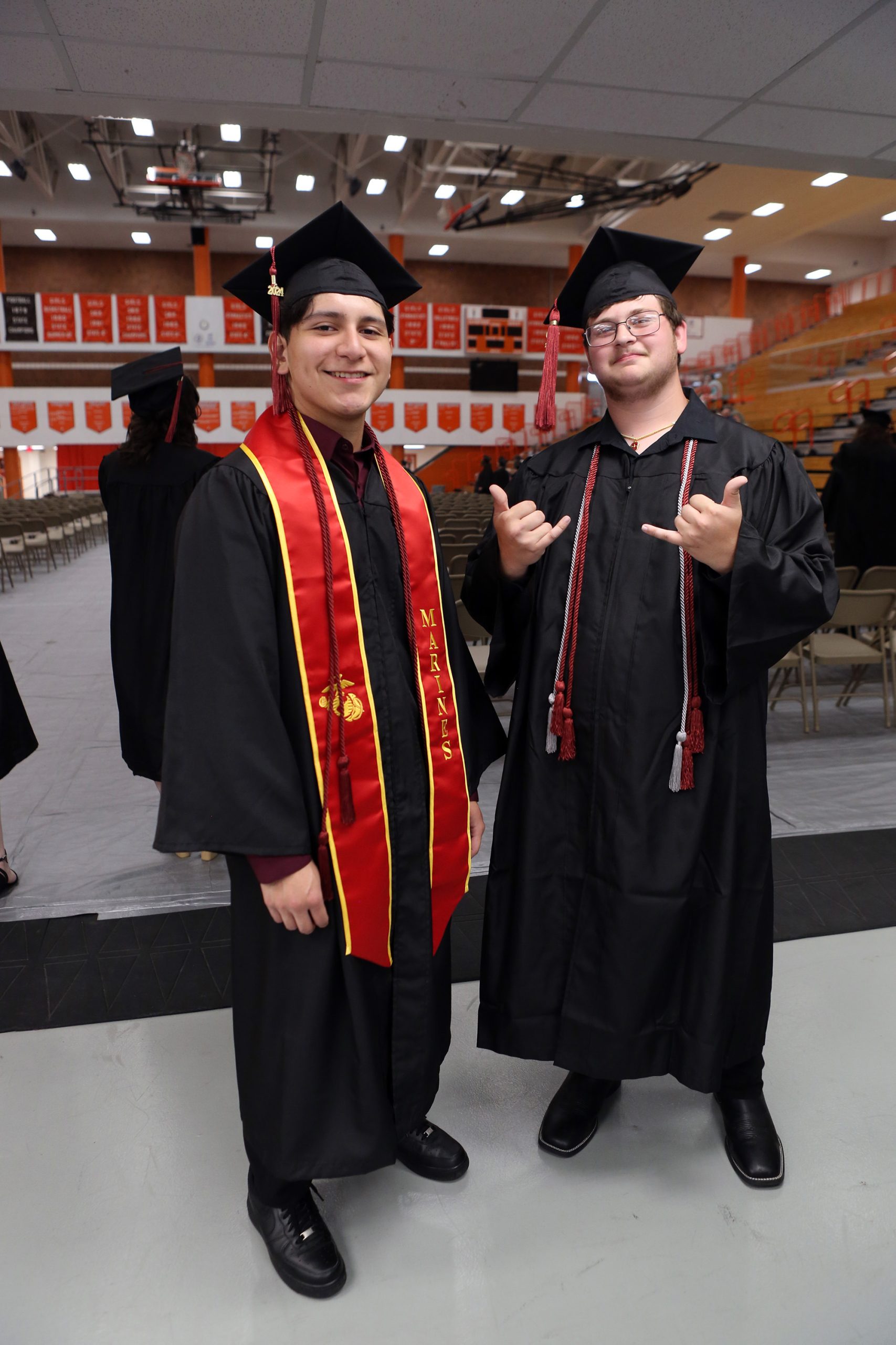 Tony Sanchez, who will be leaving for the Marines in August, and Brandon King pose for a photograph during the CSA New Tech Commencement Ceremony at Columbus East High School, Columbus, Ind., Friday, May 24, 2024.