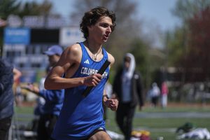 Columbus North’s Logan Vanzant runs the second leg of the 4×800-meter relay during the April 6 Columbus North Invitational.