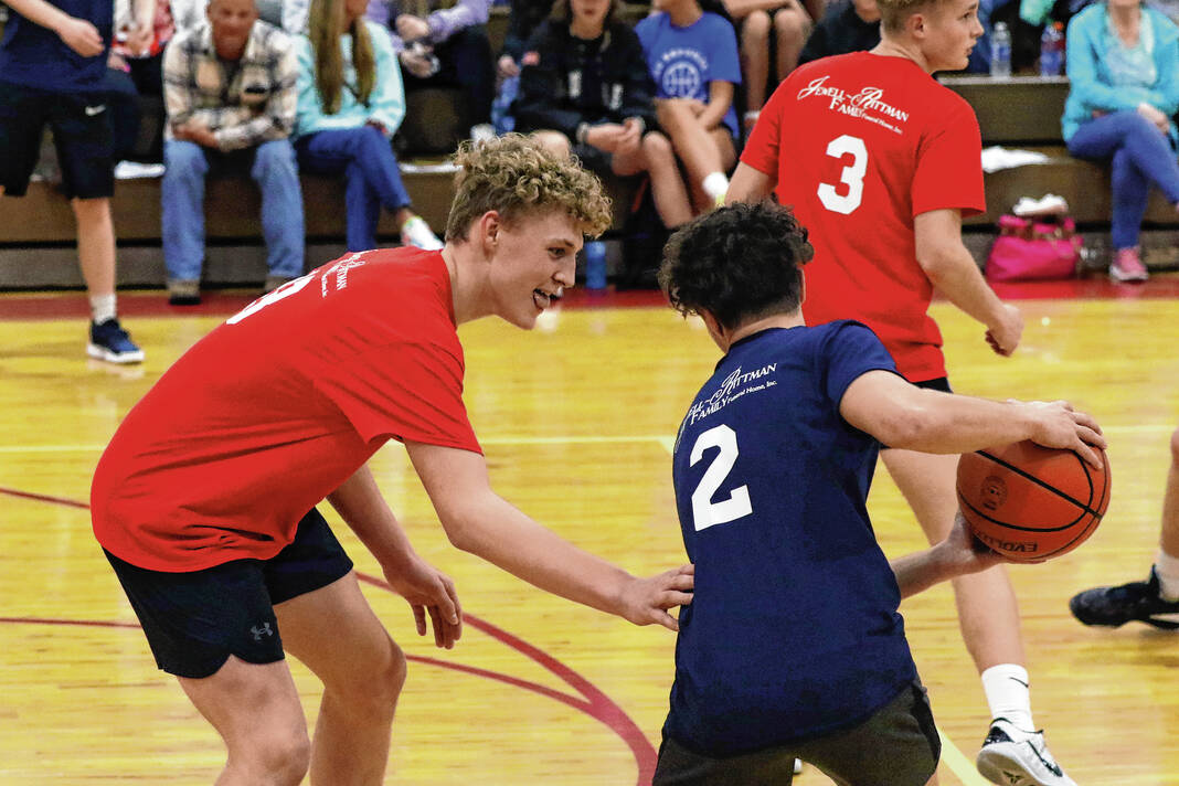 Parker Elmore, left, guards former Jennings County teammate Keegan Manowitz during the All-Area All-Star boys game March 27, 2023 at Columbus Christian. Elmore plans to play his final two years of football and basketball at Columbus North.