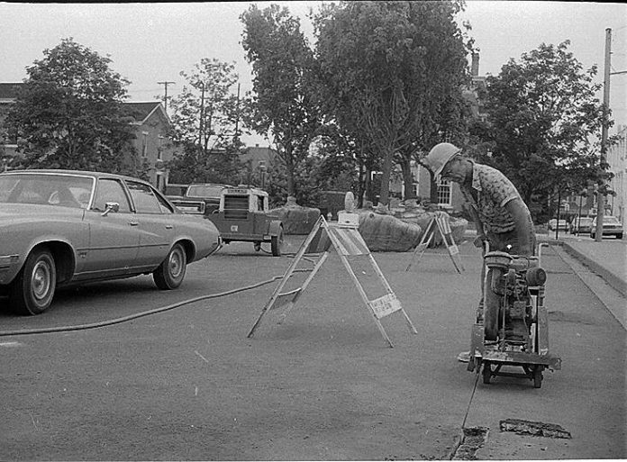 William Vandiver of Contractors United, Inc. cuts pavement on May 30, 1974, in the parking lot of the Bartholomew County Public Library.