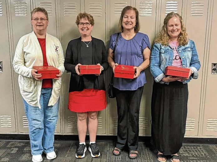 Posing for a photo, from left, are Edinburgh Community School Corp. retirees Debbie Behnke, Jennifer Garrett, Susan Pence and Kathy Ison.