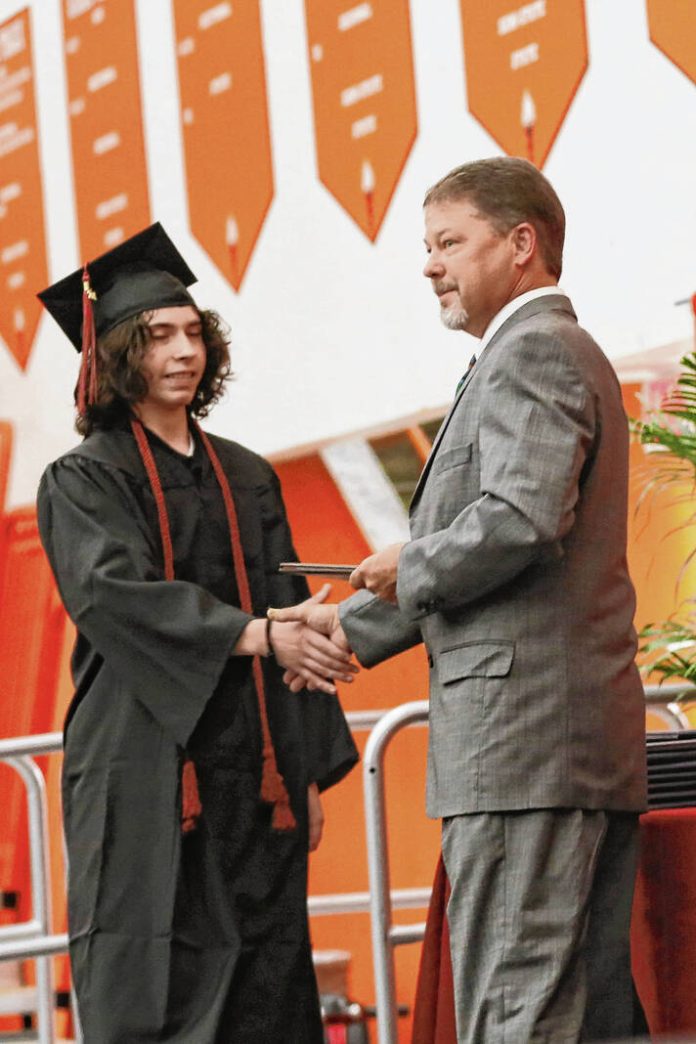 Carla Clark | For The Republic Logan Dulong receives his diploma from Principal Mike Reed during the CSA New Tech Commencement Ceremony at Columbus East High School, Columbus, Ind., Friday, May 24, 2024.