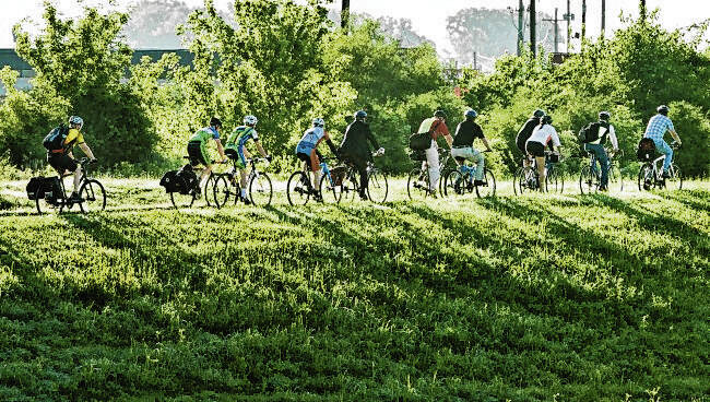 Bicyclists pedal to downtown Columbus on the People Trail near the Front Door Bridge during the annual Bike To Work Day, June 6, 2014.