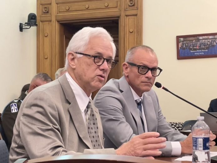 Indiana Department of Transportation (INDOT) Chief Financial Officer Joe Gustin (left) and Statewide Facilities Director Steve McAvoy answer questions on rest stop cost estimates at a Tuesday, June 11, 2024 meeting of the State Budget Committee. (Leslie Bonilla Muñiz/Indiana Capital Chronicle)