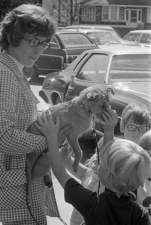 Cheryl Zuckschwerdt of the Bartholomew County Humane Society holds a puppy for children at the First United Methodist Church Vacation Bible School to pet on June 13, 1974.