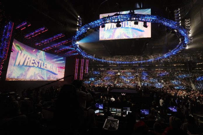FILE - A WrestleMania sign hangs over the crowd during a WWE event, Monday, March 6, 2023, in Boston. In an announcement Monday, June 24, 2024, WWE and Indiana Sports Corp. are teaming up to bring the sports entertainment company’s three largest stadium events, Royal Rumble, SummerSlam and WrestleMania, to Indianapolis. (AP Photo/Charles Krupa, File)