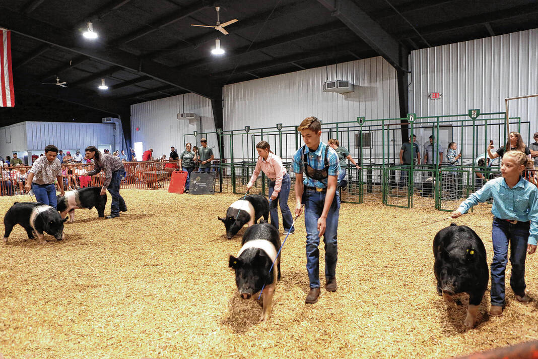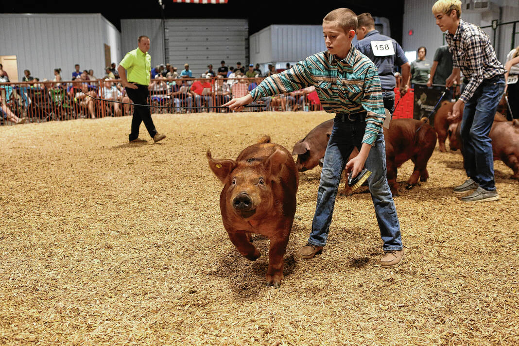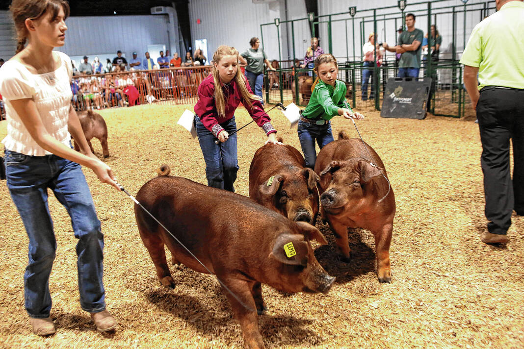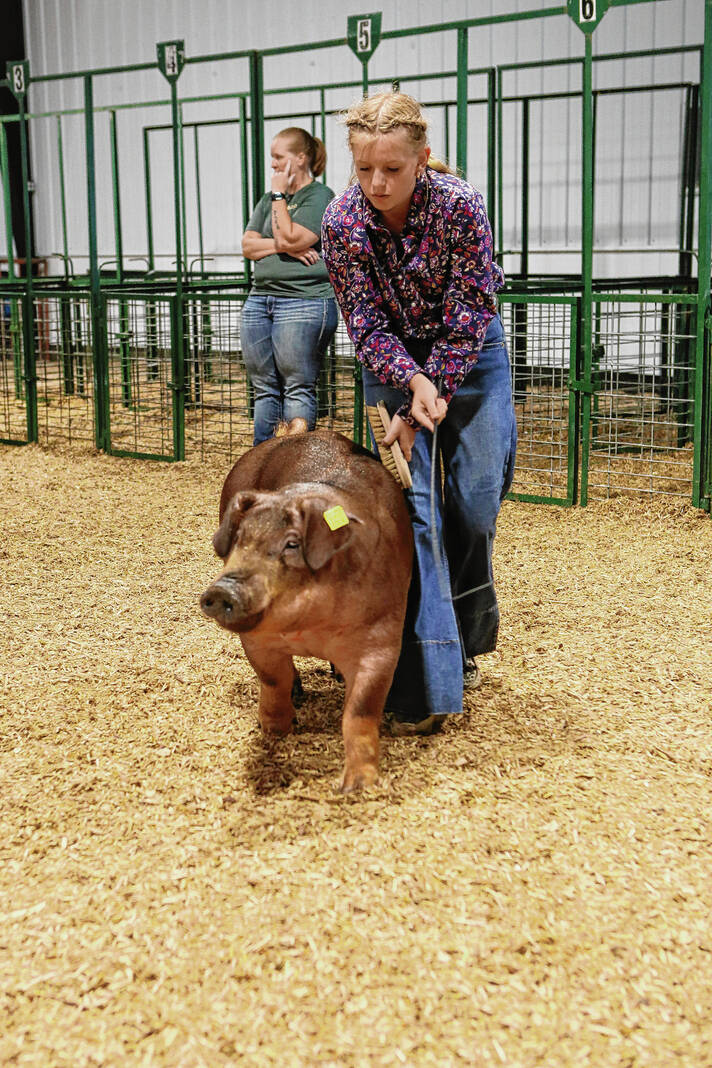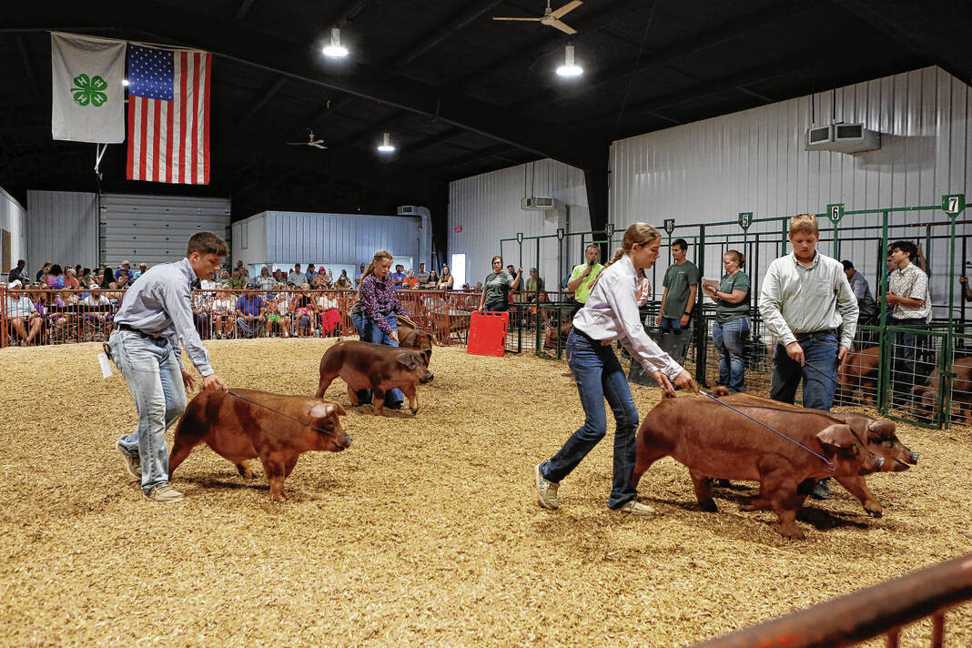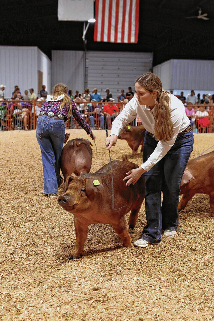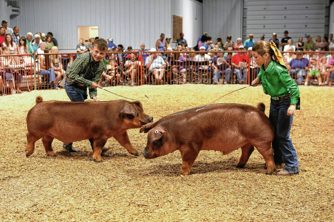 Carla Clark | For The Republic Brody Hege, at left, and Andi Hege show their Durocs during the 4-H barrow show in the livestock pavillion at the Bartholomew County 4-H Fair at the Bartholomew County Fair Grounds, Columbus, Ind., Tuesday, June 25, 2024